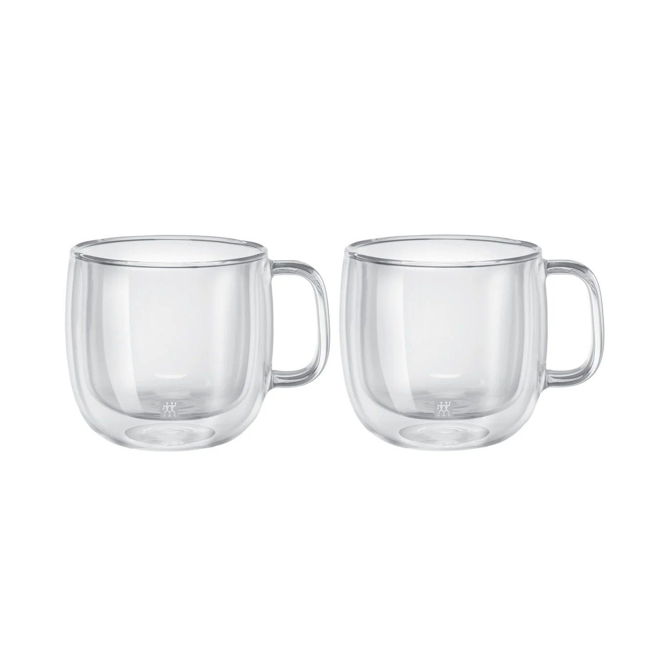 ZWILLING Sorrento Plus Cappuccinoglasset, 450 ml / 2-tlg Beschreibung Kaffeegenuss ist ja eine Wissenschaft für sich. Einige genießen ihren Lieblingskaffee vorzugsweise schwarz und andere brauchen Milch, Zucker oder sogar süßen Sirup in ihrem Heißgetränk. Besonders beliebt ist der Milchschaum, der z.B. beim Cappuccino zum Einsatz kommt. Und auch da gibt es unter den Kaffee-Liebhabern Unterschiede. Der eine mag kein Kakaopulver auf seinem Schaum, andere bevorzugen kunstvolle Bilder aus Kakaopulver von ambitionierten Baristas. Eines haben alle Cappuccino-Liebhaber gemeinsam: sie möchten Ihr Getränk heiß genießen, ohne sich die Finger zu verbrennen. Und das ist mit den doppelwandigen Borosilikatgläsern aus der Serie Sorrento Plus von ZWILLING so einfach wie nie. Dank des Henkels lassen sich die Gläser problemlos anfassen und auch die Glaswände bleiben außen schön kühl, während der Kaffee im Inneren seine Temperatur lange halten kann. Für das Cappuccino-Glas-Set wurde nur Material verwendet, das besonders leicht, langlebig und bruchunanfällig ist. Dank des 450 ml großen Fassungsvermögens darf es auch mal ein wenig mehr Kaffee sein. Das Reinigen ist in der Spülmaschine möglich und auch das Aufwärmen in der Mikrowelle funktioniert einwandfrei. Mit den handgemachten und mundgeblasenen Gläsern der Serie Sorrento Plus von ZWILLING, designt von Matteo Thun & Antonio Rodriguez, kommen Cappuccino-Fans auf Ihre Kosten Применитьung von Hand (mundgeblasene Form) Design by Matteo Thun & Antonio Rodriguez Hohe Bruchfestigkeit Spülmaschinengeeignet Eigenschaften Farbe: Transparent Material: Borosilikatglas Doppelwandig: Ja Lieferumfang: 2 Abmessungen Gewicht netto: 0,41 kg Volumen: 0,45 l Produktlänge: 14,20 cm Produktbreite: 11,00 cm Produkthöhe: 9,70 cm