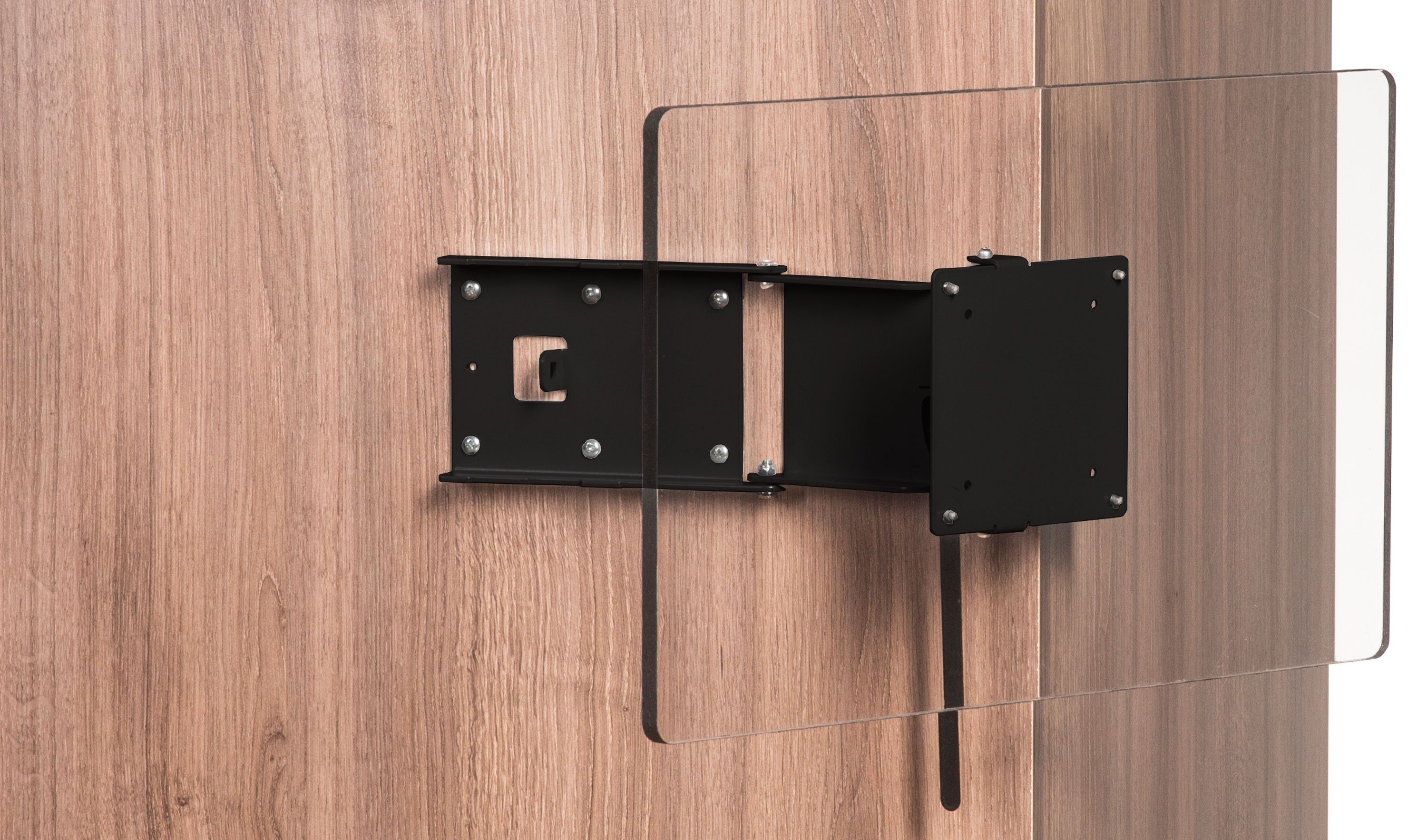 Stahl-Halter in besonders kompakter Form mit zwei Drehpunkten und Arretiervorrichtung, klappt nach rechts auf.