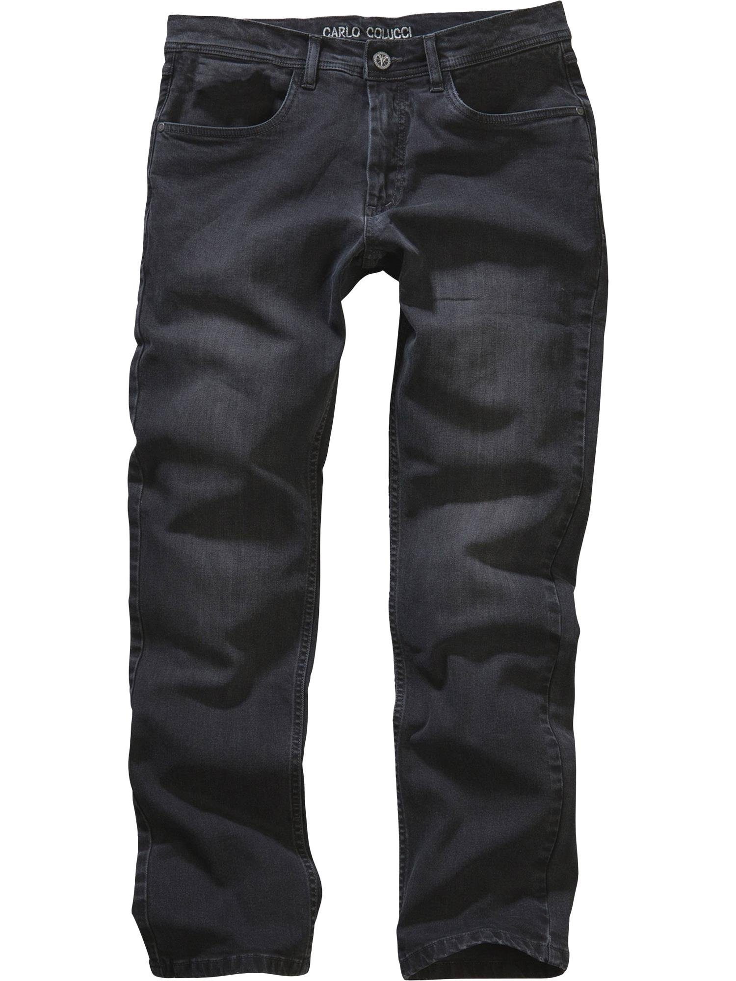 Die 5-Pocket Herren Jeans von Carlo Colucci ist aus einer Baumwollmischung mit Stretch-Anteil gefertigt. Die Jeans hat ein gerades Bein und hat ein Fake Leder Patch mit Logoprägung am Bund. Die Ширина пояса beträgt bei Размер W34 L 34 ca. 87,5 cm.