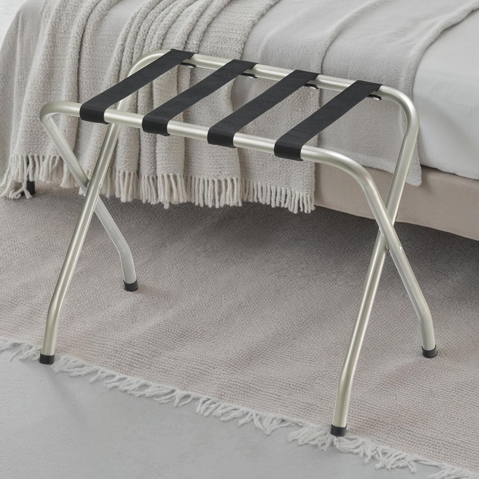 Der Kofferständer Luggage ist platzsparend zusammenklappbar und findet auch im kleinsten Zimmer seinen Platz. Die schwarzen strapazierfähigen Gurte sorgen für eine schonende Ablage Ihrer Gepäckstücke. Diese dürfen auch gerne etwas schwerer sein, da der Kofferbock mit 30 kg belastbar ist. Die Gummifüße schonen zudem Ihre Böden.