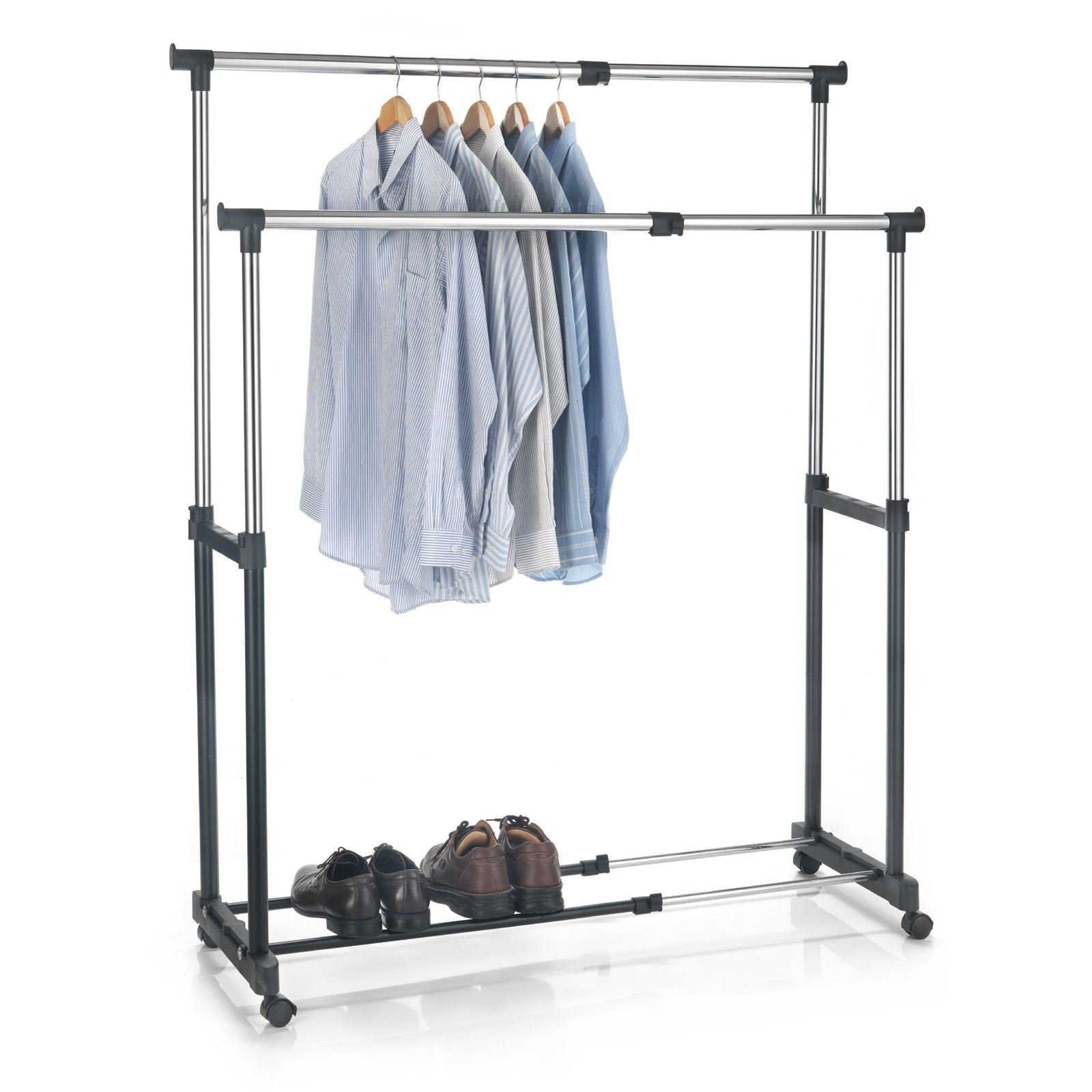 hilft Ordnung im Ankleide- und Schlafzimmer zu halten. Das Gestell bietet mit 2 Kleiderstangen, die in der Höhe und Breite verstellt werden können, genügend Platz für Jacken, Blusen, Hemden oder Hosen. Zusätzlich können auf den unteren Stangen Schuhe abgestellt werden, womit Sie weiteren Platz sparen. Der Garderobenwagen ermöglicht ein sicheres Aufstellen, dank der 4 Rollen, wovon 2 Rollen gebremst sind.