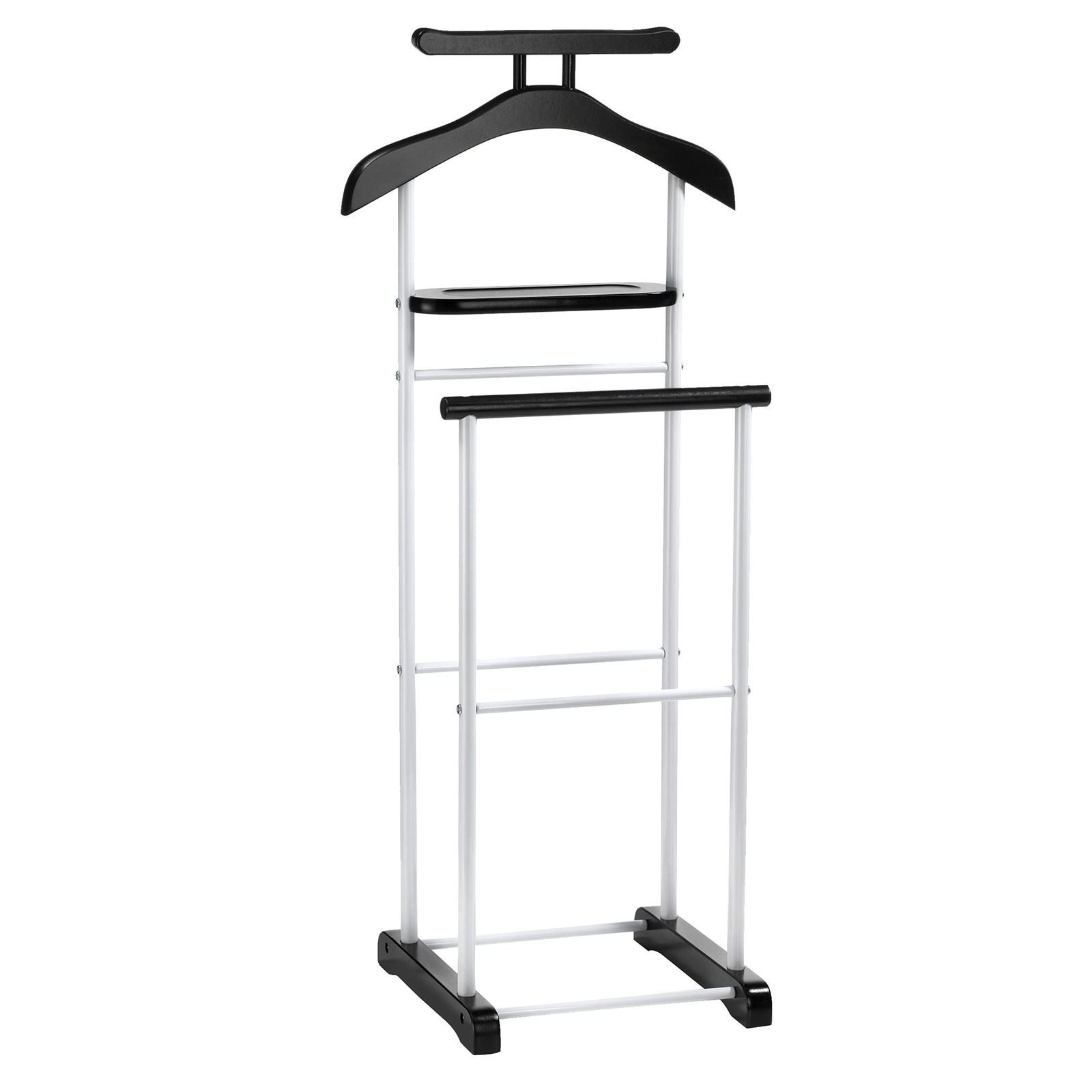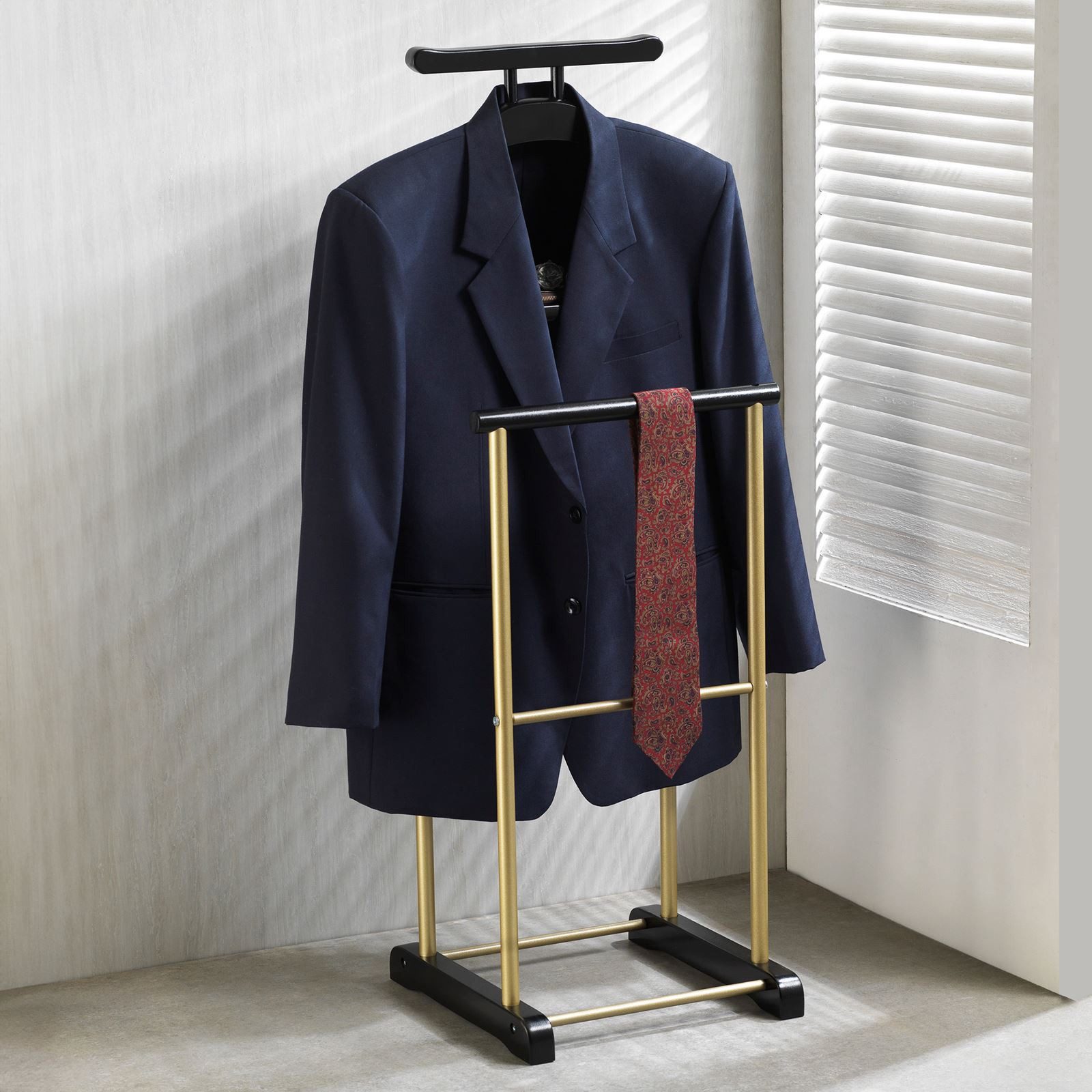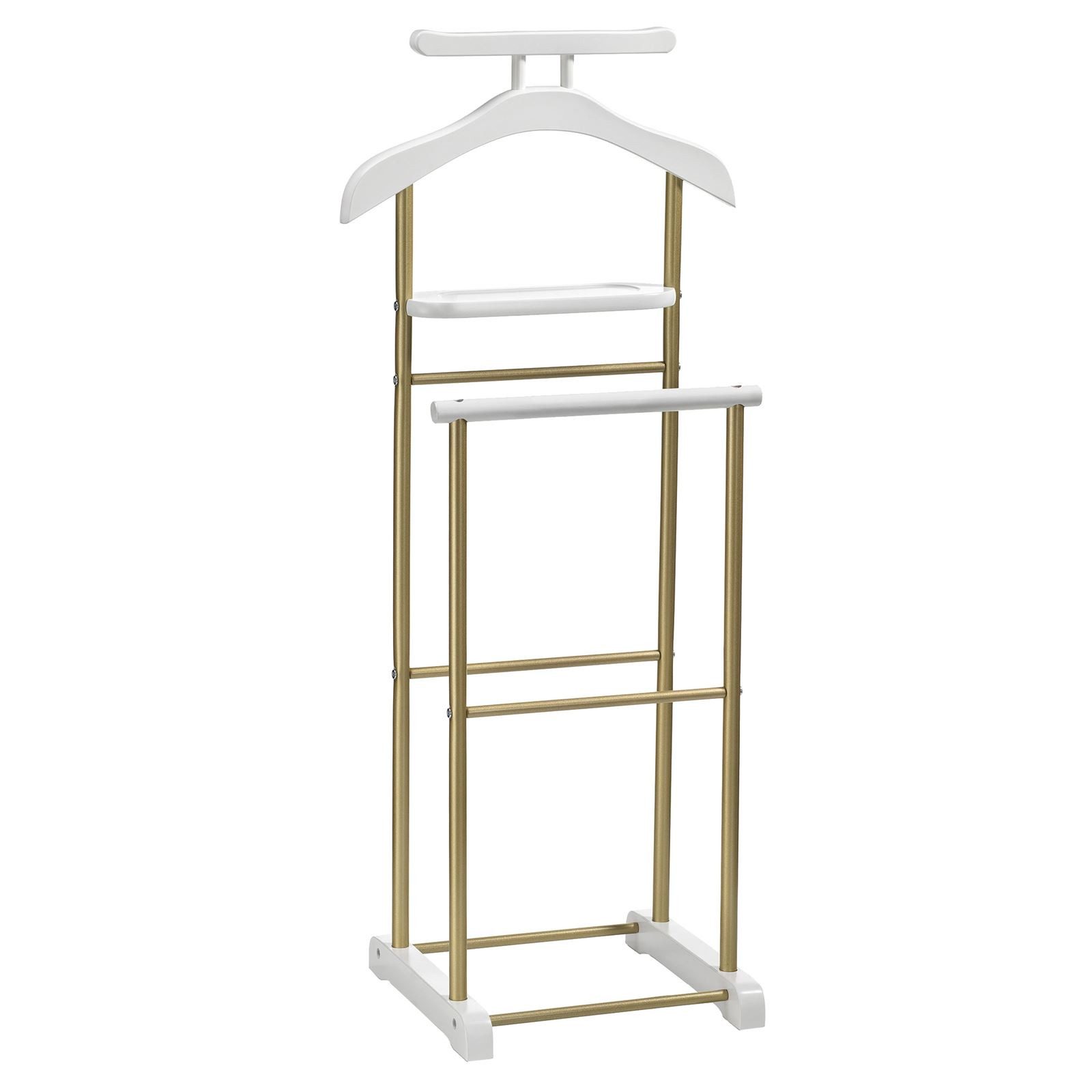 Entdecken Sie den Medina Herrendiener, ein eleganter und funktionaler Begleiter für Ihr Schlafzimmer. In gold lackiertem Metall und schwarzen MDF-Elementen ist dieser Kleiderdiener nicht nur praktisch, sondern auch ein stilvolles Möbelstück. Ideal zur übersichtlichen Aufbewahrung von Kleidung und Accessoires, bietet er einen Kleiderbügel, einen Hosenbügel sowie eine Ablagefläche. Seine zusätzlichen Zwischengestänge sind perfekt für Gürtel, Krawatten und Tücher.