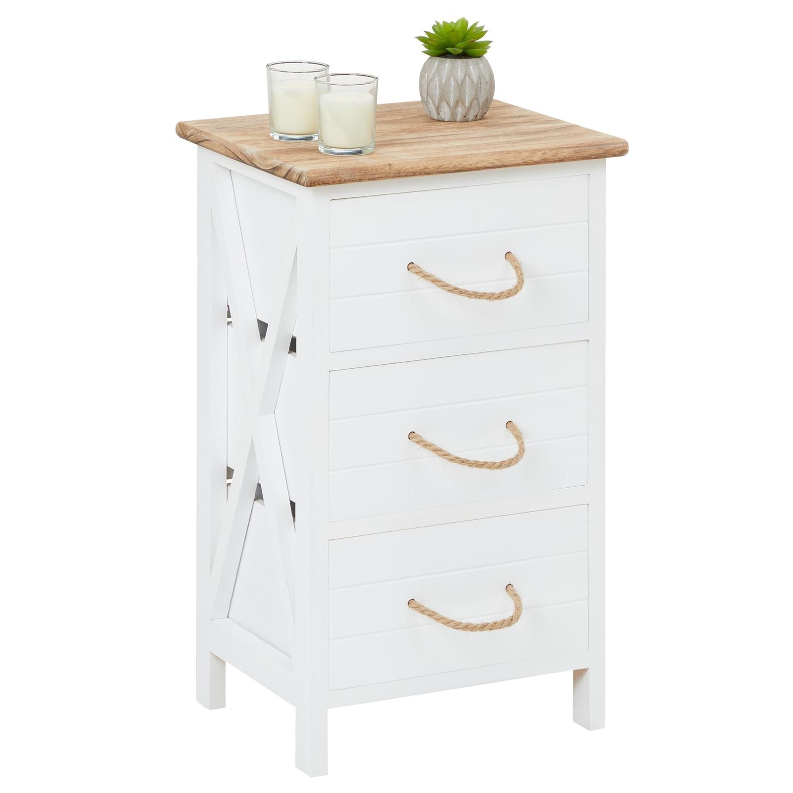 beeindruckt mit einem tollen Design im klassischen Landhaus-Stil. Die dekorative Seitenansicht mit den individuellen Schubladengriffen aus Sisal rundet das harmonische Gesamtbild ab. Mit 3 Schubladen ausgestattet, in denen die Lesebrille, das Lieblingsbuch, Kerzen usw. aufbewahrt werden können, bietet die Nachtkommode ausreichend Stauraum. Zusätzlichen Platz, für Blumenvasen, die Nachttischlampe oder den Wecker bietet die dekorative Ablageplatte .