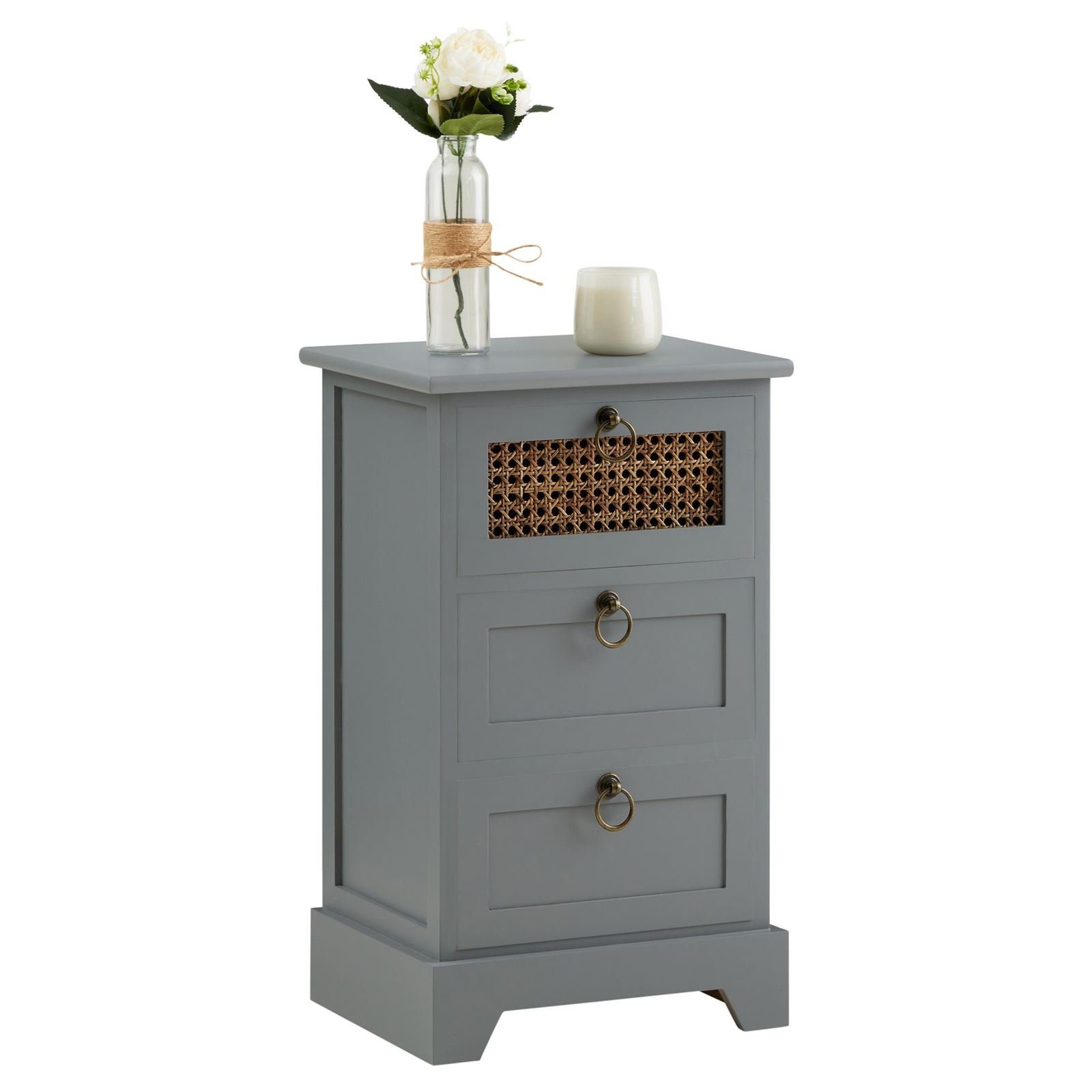im Boho Style holen Sie sich einen wahren Hingucker und eine Portion Retro Touch in Ihr Schlafzimmer. Hergestellt aus hochwertigem Paulowniaholz und einer Front mit handgeflochtenem Wiener Geflecht setzt der Nachttisch wahre Akzente in Ihre Einrichtung und bietet zudem viel Stauraum. In den drei Schubladen ist Platz für Accessoires, Brille, Kosmetika und alles, was Sie für einen guten und ruhigen Schlaf brauchen. Die Griffe an den Schubladen in Ringform setzen ein weiteres Highligt. Die Kommode kann aufgrund der passenden Höhe auch als Nachttisch für Betten mit hoher Liegefläche genutzt werden.