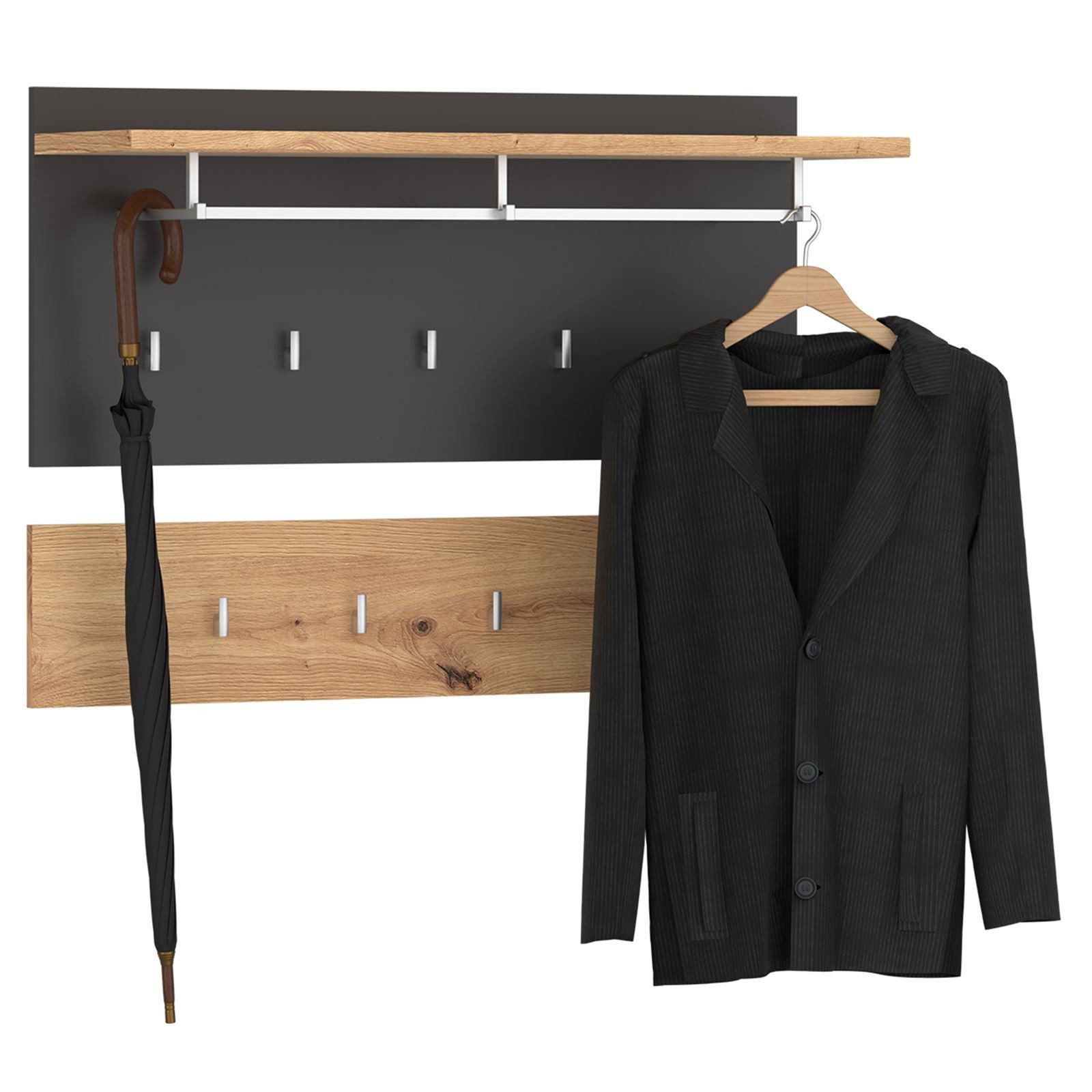 Entdecken Sie Bilbao, die Wandgarderobe, die in keinem Flur fehlen sollte. Mit einer ansprechenden Farbkombination aus Artisan Eiche und Kosmos Grau passt sie perfekt zu jedem modernen Einrichtungsstil. Die Garderobe bietet neun robuste Kleiderhaken, eine praktische Kleiderstange sowie eine obere Hutablage. Die modulare Anordnung der zwei Paneelen ermöglicht eine individuelle Gestaltung Ihres Eingangsbereichs. Ein unverzichtbares Flur-Möbel-Set für Ordnung und Stil.