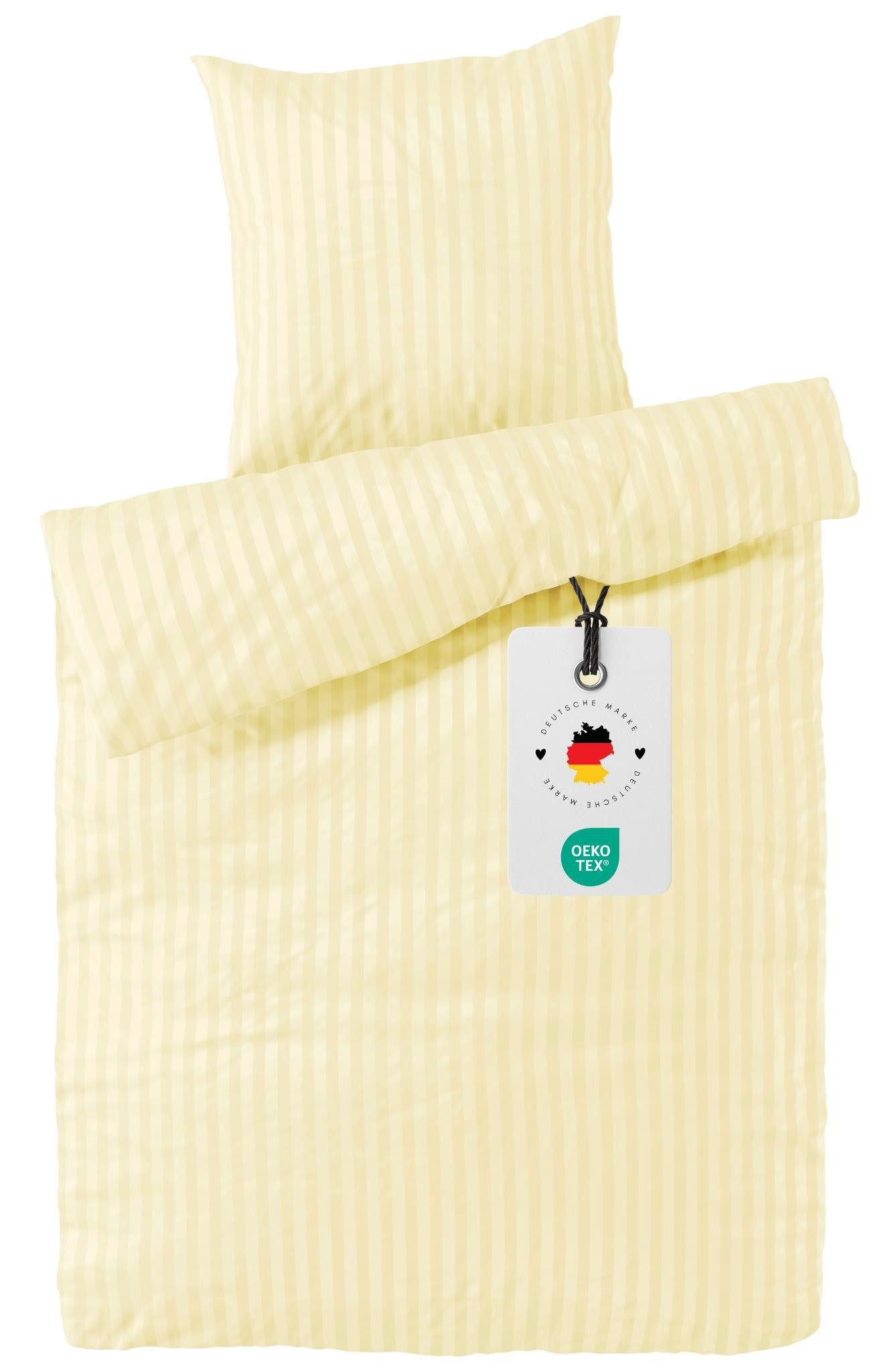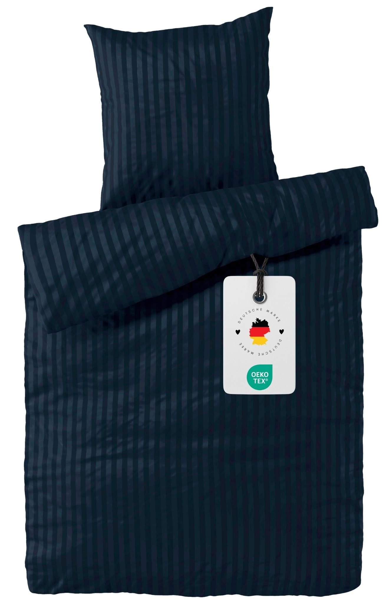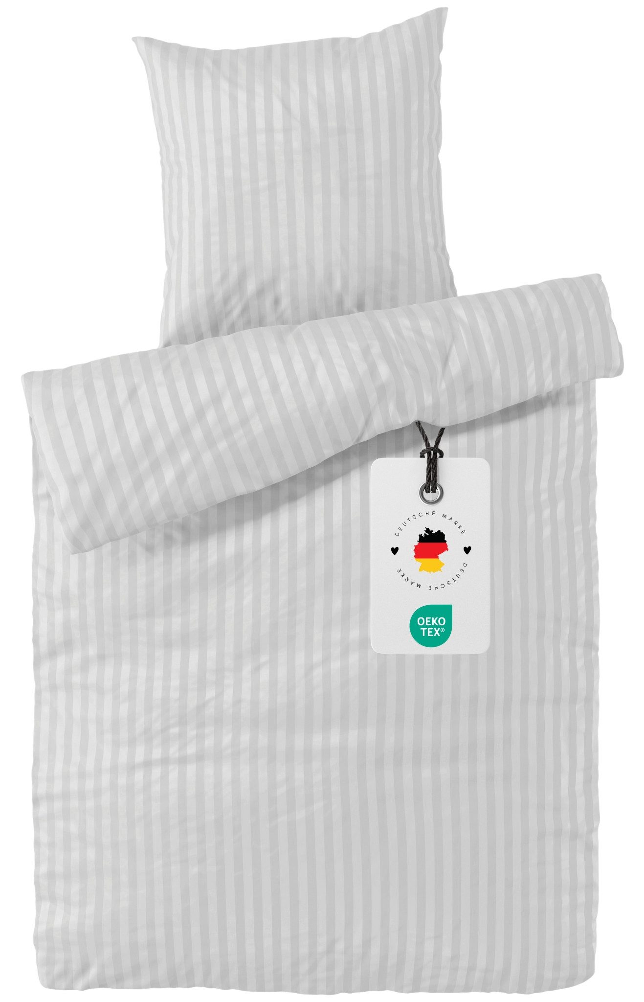 Die wunderschöne und besonders edle Damast Bettgarnitur von Carpe Sonno ist zu 100 % aus feinster, gekämmter Baumwolle, die in feinen Fäden in Atlasbindung gewebt wird und so die leicht glänzende Streifen-Musterung ergibt. Mit ihrem zeitlosen Stil, dem zurückhaltenden Design und der herausragenden Qualität verfügt dieses Bettset über Luxus-Hotelqualität. Dank 100% Baumwolle auch bestens für Всеrgiker geeignet.
