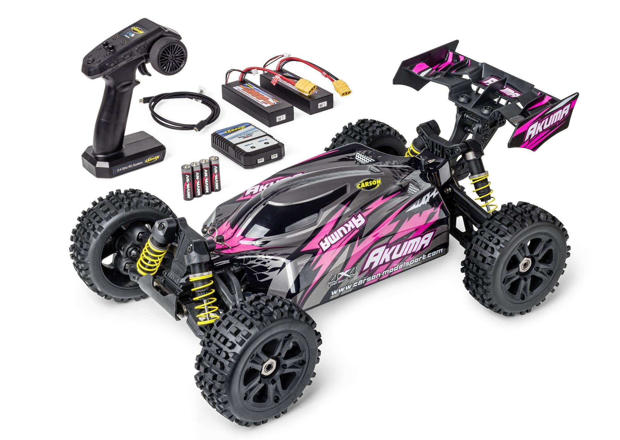Entdecke den Carson 1:8 Akuma Buggy 4WD 100 Prozent RTR Pink, ein leistungsstarker Offroad-Buggy der Extraklasse. Dieser Ready-to-Run Buggy ist perfekt für alle, die höchste Ansprüche an Leistung, Qualität und Fahrspaß stellen - egal ob Anfänger oder erfahrener RC-Pilot. Dank modernster Brushless-Technologie und einem robusten 4WD-Antrieb meistert der Akuma jedes Gelände mit Leichtigkeit.