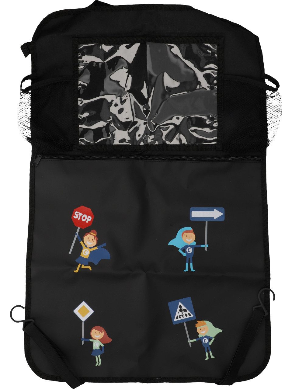 Mit dem Cartrend KIDS Autositz-Rückenlehnenschutz lassen sich die empfindlichen Rückseiten der Sitze vor Verschmutzungen und Abnutzung schützen. Gerade kleine Kinder beschmutzen zum Beispiel mit feuchten oder dreckigen Schuhen oft unbeabsichtigt die Rückseite des Sitzes. Dieser Trittschutz für den Rücksitz verhindert dies effektiv. Die Reinigung des Schutzes selbst ist einfach, denn das Material lässt sich schnell abwischen. Mit einer Размер von etwa 69 x 44 cm (H x B) deckt der Schutz den gesamten Bereich des Sitzes ab. Die Befestigung gelingt schnell und sicher. Hierfür verfügt der Autositz Rückenlehnenschutz über Steckschnallen und Haken. So passt sich der Schutz auch einfach an verschiedene Größen von Sitzen an. Oftmals bietet etwa ein Amazon Rückenlehnenschutz keine weiteren Funktionen an. Anders der Cartrend KIDS Autositz Rückenlehnenschutz. Dieser ist gleichzeitig Rückenlehnenschutz und Organizer. So bieten die Autositz Rückenlehnentaschen Platz für verschiedene Gegenstände. Die große Tasche ist mit einem Reißverschluss ausgestattet. Diese untere Tasche ist zum Beispiel für Comics, Malbücher und ähnliche Dinge gedacht. Gleichzeitig ist diese Tasche aus halbtransparentem Mesh-Material gefertigt. Das erlaubt es, mit einem Blick den Inhalt zu prüfen und Dinge schnell zu finden. Die andere Tasche ist aus durchsichtigem Plastik. Hier lässt sich beispielsweise ein Tablet sicher einschieben, das unterwegs der Unterhaltung dient. Kabel für die Stromversorgung passen durch Löcher in die Tasche und die Hülle ist touchscreenfähig. So können selbst Kleinkinder während der Fahrt einen Zeichentrickfilm schauen. Zusätzlich gibt es 2 universelle Getränkehalter. Hier können Dosen oder Trinkflaschen sicher untergebracht werden, sodass diese während der Fahrt nicht umkippen und den Wagen beschmutzen. Das Design mit den Cartrend KIDS Heroes ist ganz auf die junge Zielgruppe zugeschnitten und so setzt diese Autositz Rückenlehnentasche auch einen bunten Akzent im Fahrzeug.
