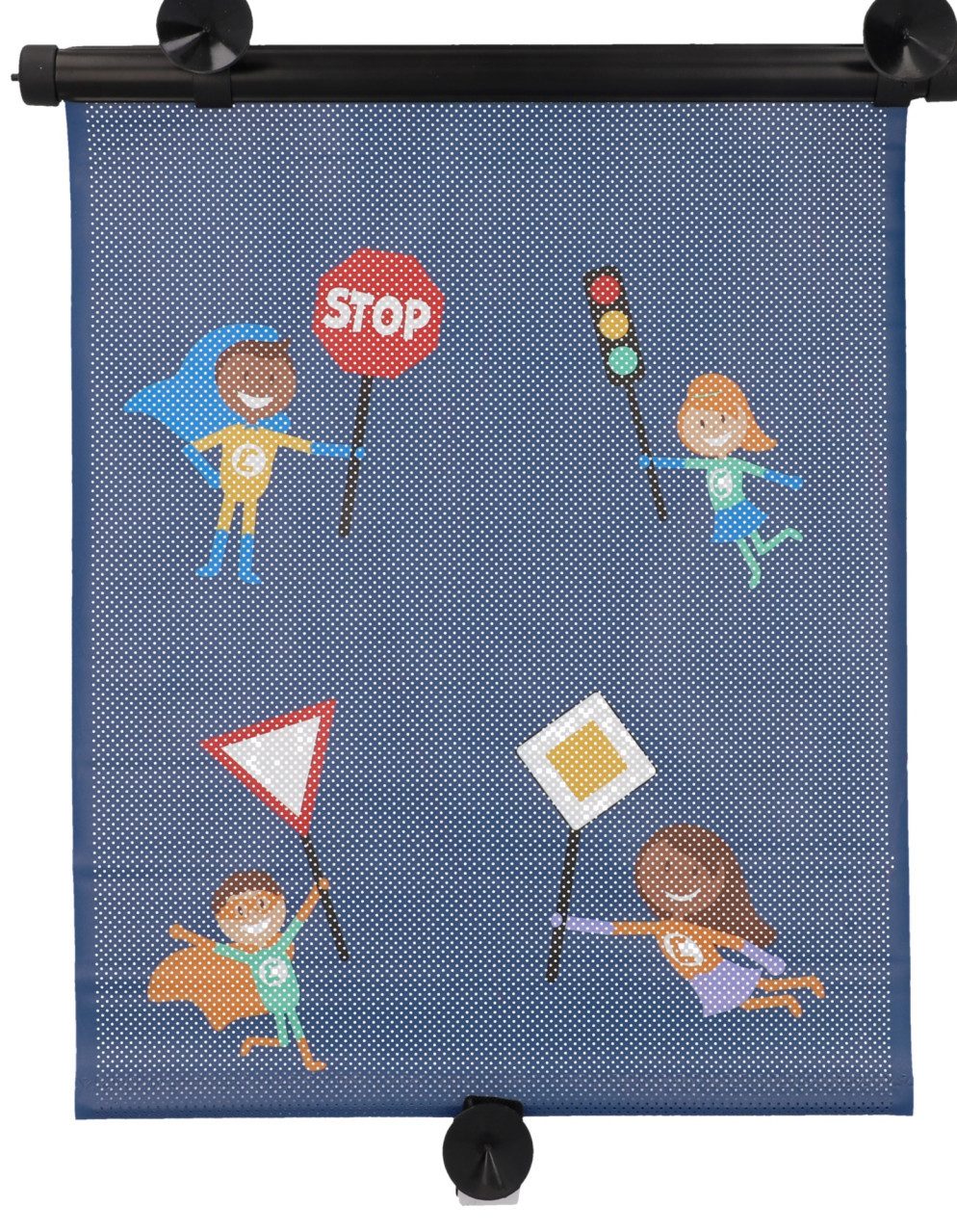 Das Cartrend KIDS Sonnenrollo für Autos schützt an heißen Sommertagen die jungen Mitfahrer vor der direkten Sonneneinstrahlung. Es handelt sich um ein Set mit 2 gleichen Rollos. So lassen sich 2 Seitenfenster oder die Heckscheibe verdunkeln. Das Design der Cartrend KIDS Rollos ist speziell auf Kinder ausgelegt. So sind auf dem Rollo die bunten Figuren der Cartrend Heroes aufgedruckt. Diese Sonnenschutz Rollos für das Auto verhindern, dass sich das Fahrzeuginnere durch die direkte Sonneneinstrahlung aufheizt. Gleichzeitig schützt ein solches Rollo die Kinder vor den ungesunden UV-Strahlen. Da die Sonnenrollos für das Auto aus der Reihe Cartrend KIDS aus einem halbtransparentem Mesh-Material gefertigt sind, ist der Blick nach draußen weiterhin möglich und die Kinder können während der Fahrt die Umgebung beobachten. Die Höhe kann individuell reguliert werden, denn das Cartrend KIDS Sonnenrollo ist aufrollbar. Hilfreich hierbei ist der praktische Arretierknopf, der das Rollo auf der gewünschten Höhe hält. Das ist zudem vorteilhaft, wenn das Rollo nicht benötigt wird. So lässt es sich platzsparend aufrollen und verstauen. Mit einer Размер von etwa 40 x 45 cm (B x L) ist das Sonnenschutzrollo für alle gängigen Automodelle geeignet und passt auf alle Fenster. Die Befestigung ist simpel und gelingt in wenigen Sekunden. So lässt sich das Rollo mit den 3 Saugnäpfen ganz einfach auf jeder Glasoberfläche anbringen. Alternativ ist es möglich, das Sonnenrollo im Fenster einzuklemmen. Die Verpackung bietet zusätzlich die Option, die Cartrend-Heroes-Figuren auszuschneiden und zum Basteln zu nutzen.