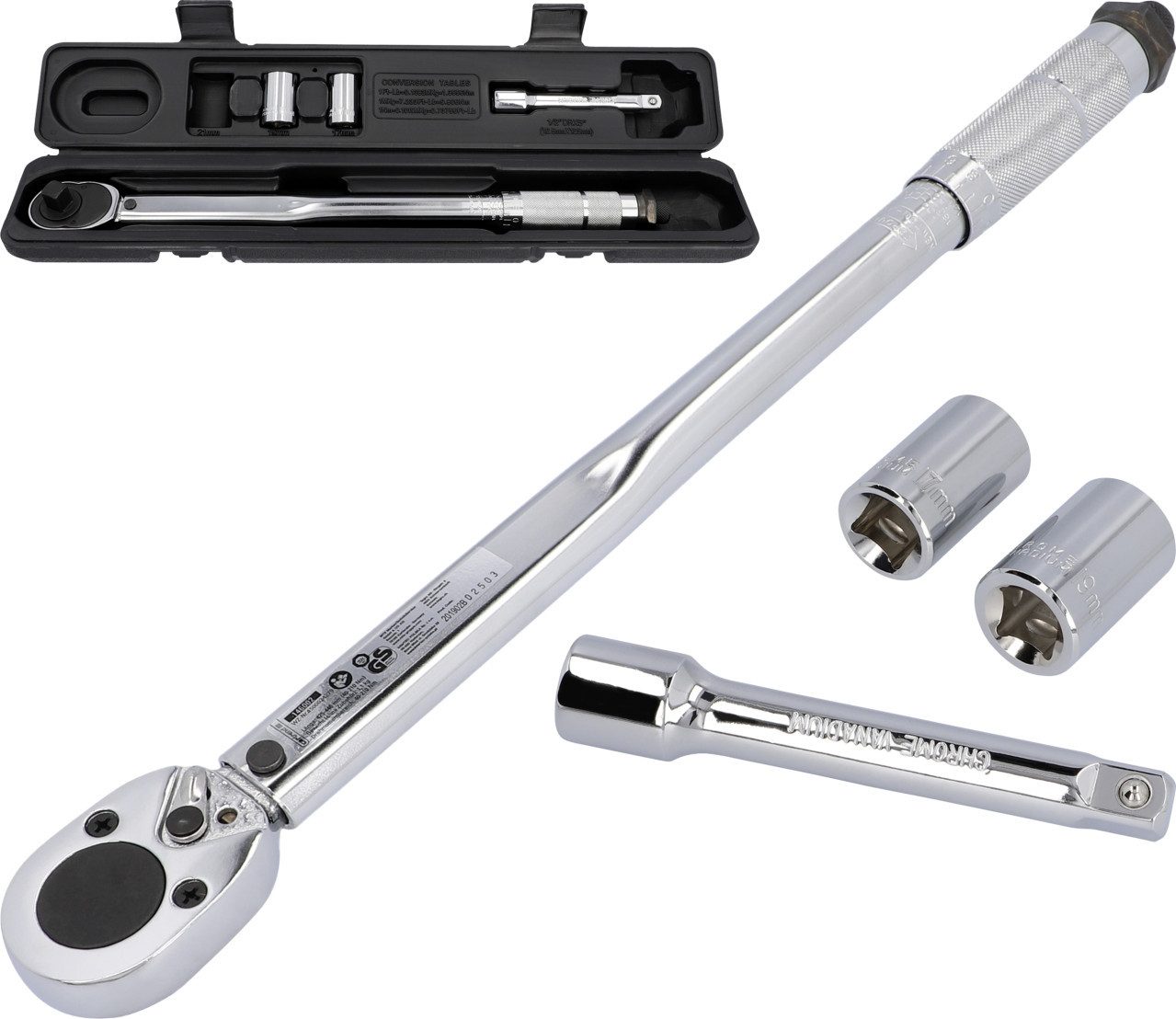 Produktdetails: Mit gängigem 12,7 mm (1/2 '') Vierkantantrieb | inkl. 2 Stecknüsse (17 und 19 mm) und Verlängerung aus Cr-V 125 mm | Meßbereich: 40-210 Nm, hohe Genauigkeit (+/- 4%) nach DIN 6789 kalibriert | mit verstellbarem Rechts- und Linkslauf | mit rutschfestem Griff | aus hochfestem Chrom-Vanadium-Stahl (Cr-V) | inkl. robuster Aufbewahrungsbox für eine praktische Lagerung und einen sicheren Transport | TÜV-zertifiziert mit GS-Siegel |