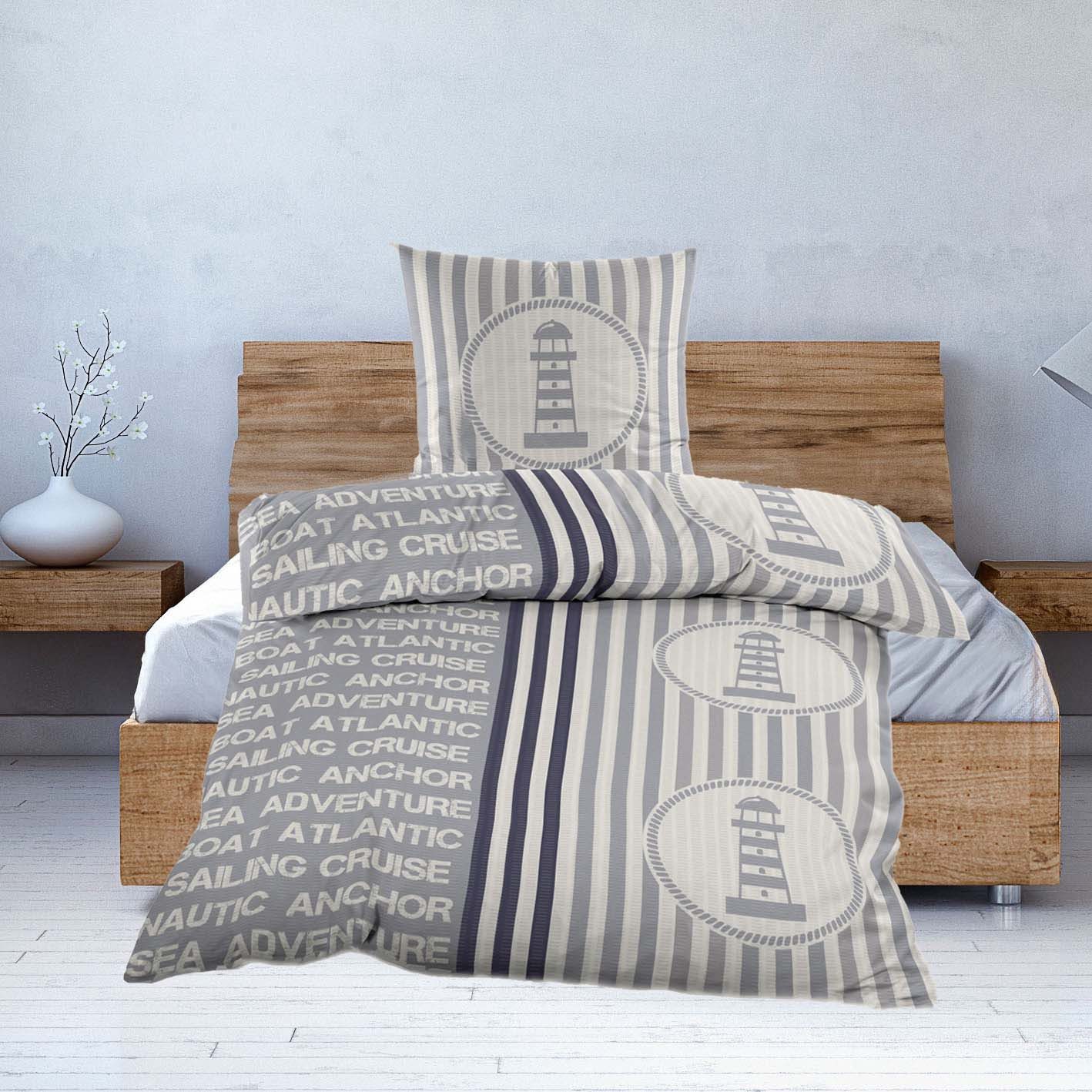 Seersucker Bettwäsche – 135x200cm Decke, 80x80cm Kissen, Grau gestreift mit Leuchtturm Motiv