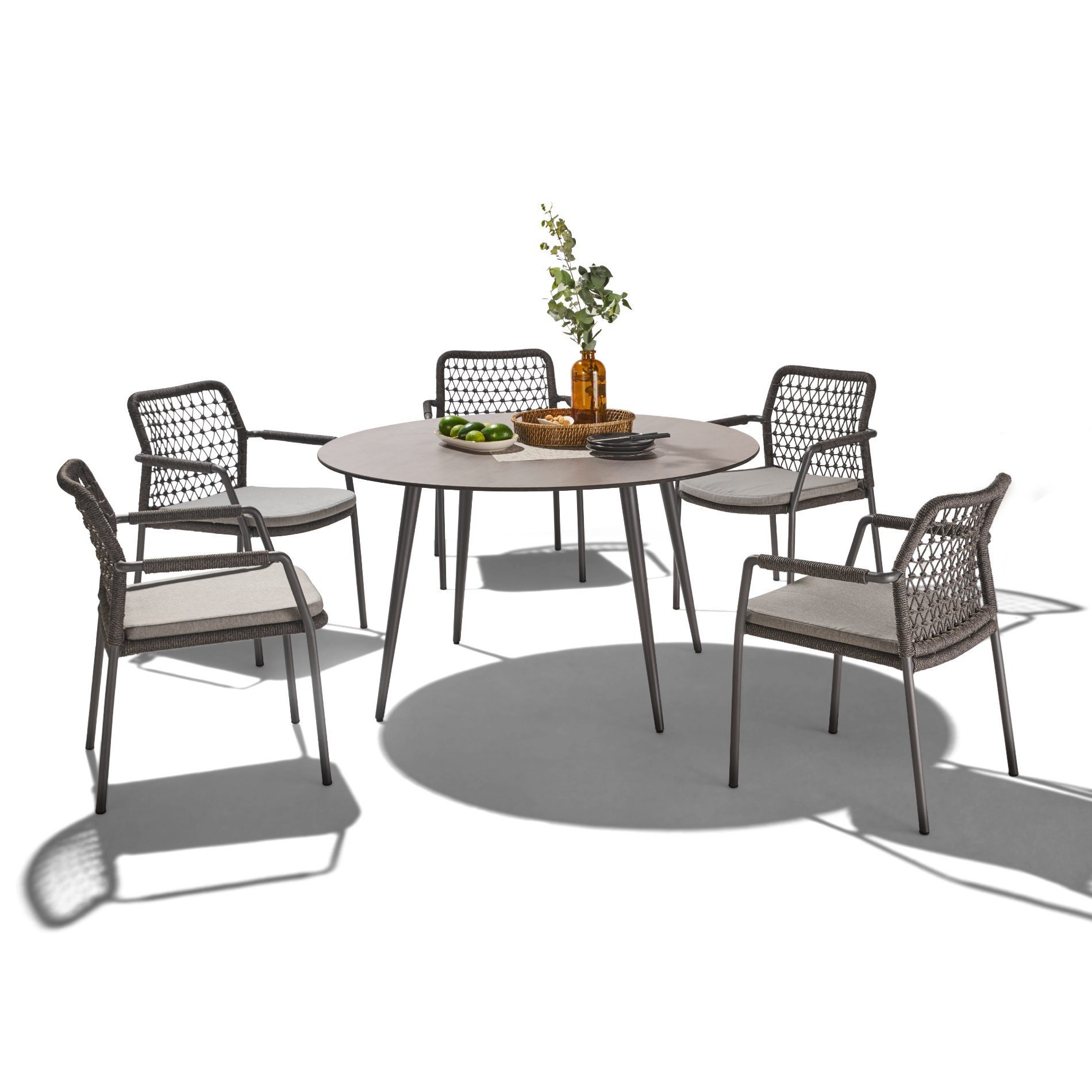 Die Stühle "Fasano" bieten mit ihrer UV-beständigen Rope-Bespannung optimalen Komfort. Wählen Sie zwischen einem Knoten- oder Quadro-Muster für die Rückenlehne – jeweils in der Farbe passend zum Gestell. Die Sitzkissen aus Olefin sind wasserabweisend, abnehmbar und waschbar. Die beige Варианты ist zusätzlich mit Sunproof®-Stoff ausgestattet – besonders schimmel- und fleckenresistent.