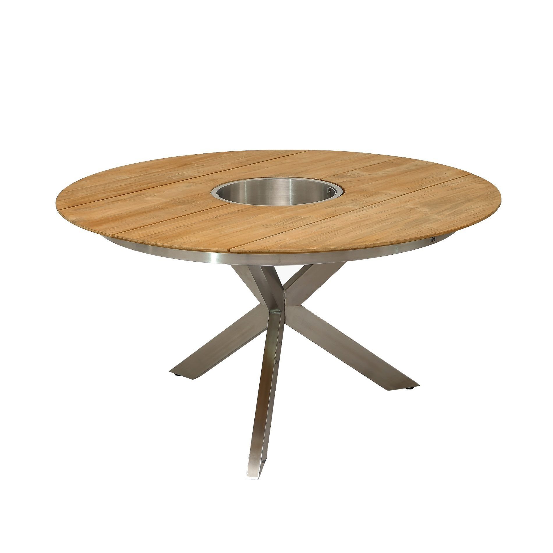 In der Mitte des runden Tisches befindet sich eine Edelstahl-Abdeckung, darunter die Aussparung für einen Flaschenkühler. Der Tisch kann selbstverständlich mit und ohne Kühler genutzt werden.