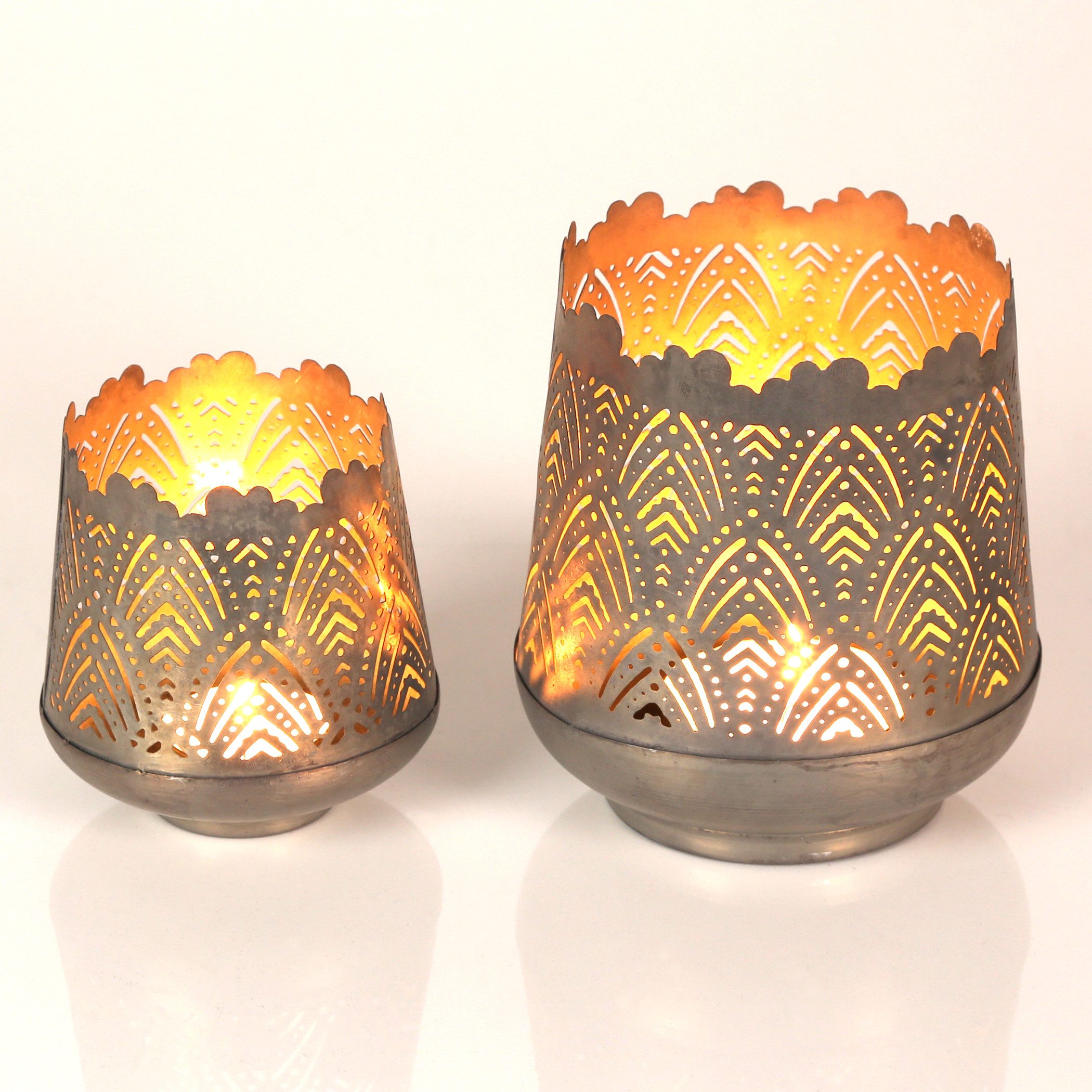 Lass dich von der Harmonie aus filigraner Handarbeit und zeitloser Ästhetik begeistern, die dieses handgefertigte Teelichthalter-Set zu einem wahren Blickfang macht. Die kunstvoll eingearbeiteten Blattmuster, inspiriert von der Schönheit der Natur, erschaffen faszinierende Lichtspiele und verleihen deinem Zuhause eine warme, einladende Atmosphäre.