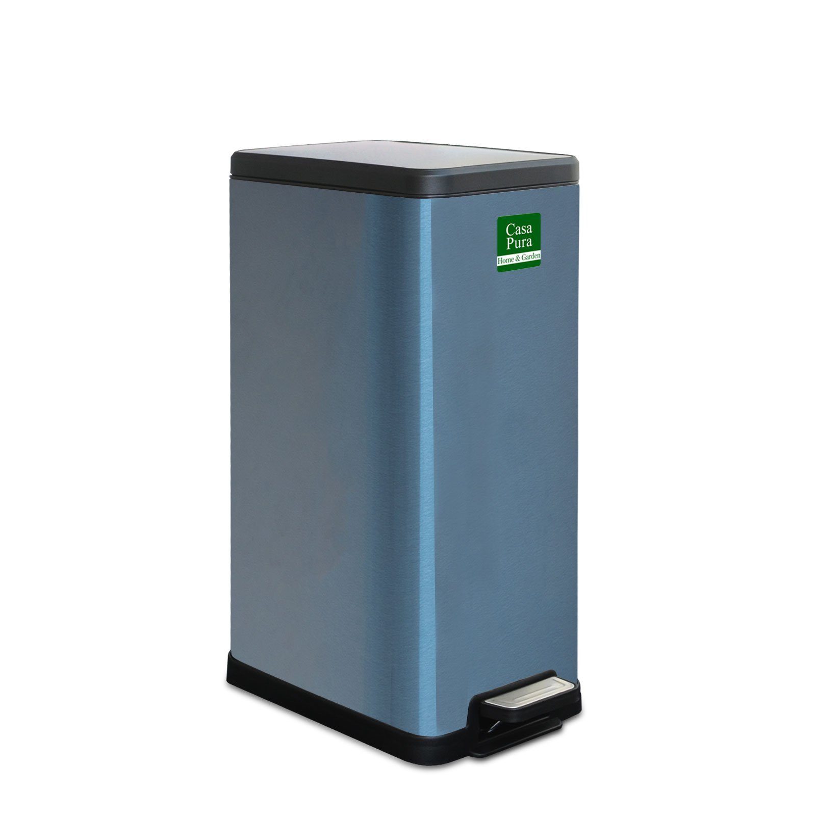 Das Gehäuse des Tretmülleimers besteht zum größten Teil aus robustem, rostfreiem Edelstahl. Einzelne Elemente sind aus stabilem Kunststoff gefertigt. Der herausnehmbare Abfallbehälter besitzt einen praktischen Henkel und kann kinderleicht entnommen und wieder eingesetzt werden. Zum Öffnen wird einfach das Pedal an der unteren Seite des Tretabfalleimers mit dem Fuß betätigt. Der Deckel ist mit einem verstellbaren Schließdämpfer versehen, welcher die Geschwindigkeit des Schließvorgangs reguliert. Das Спрятать des Deckels erfolgt dabei automatisch und angenehm leise.