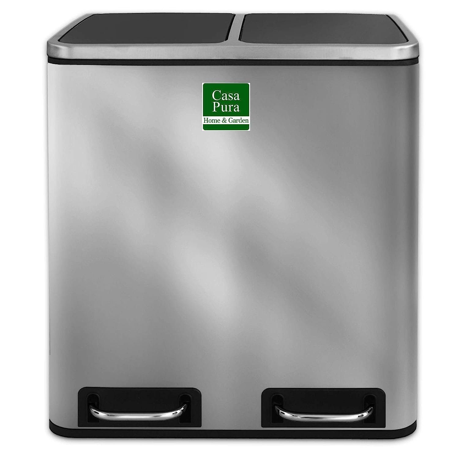Der Tretmülleimer besteht aus rostfreiem und robustem Edelstahl und ist in den Farbvarianten Edelstahl, Schwarz, Himbeerrot und Türkisblau zusätzlich pulverbeschichtet. Hinzu kommen hochwertige Polypropylen-Elemente. Die beiden Abfallbehälter sind herausnehmbar und besitzen jeweils einen praktischen Henkel. Zum Öffnen wird einfach das gewünschte Pedal an der unteren Seite des Tretabfalleimers mit dem Fuß betätigt. Die Deckel sind mit einem integrierten Schließdämpfer versehen und schließen daher automatisch und angenehm leise. Für ein problemloses und komfortables Heben besitzt der Tretmülleimer an den Seiten eingefasste Griffe.