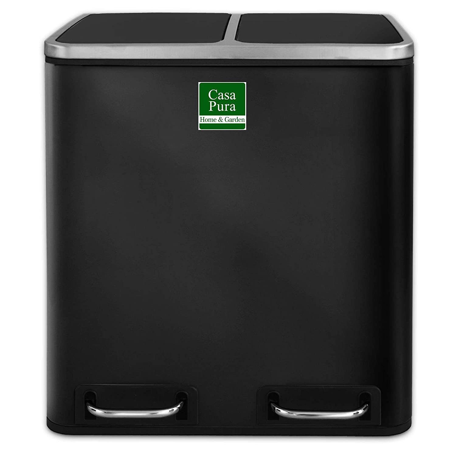 Der Tretmülleimer besteht aus rostfreiem und robustem Edelstahl und ist in den Farbvarianten Edelstahl, Schwarz, Himbeerrot und Türkisblau zusätzlich pulverbeschichtet. Hinzu kommen hochwertige Polypropylen-Elemente. Die beiden Abfallbehälter sind herausnehmbar und besitzen jeweils einen praktischen Henkel. Zum Öffnen wird einfach das gewünschte Pedal an der unteren Seite des Tretabfalleimers mit dem Fuß betätigt. Die Deckel sind mit einem integrierten Schließdämpfer versehen und schließen daher automatisch und angenehm leise. Für ein problemloses und komfortables Heben besitzt der Tretmülleimer an den Seiten eingefasste Griffe.