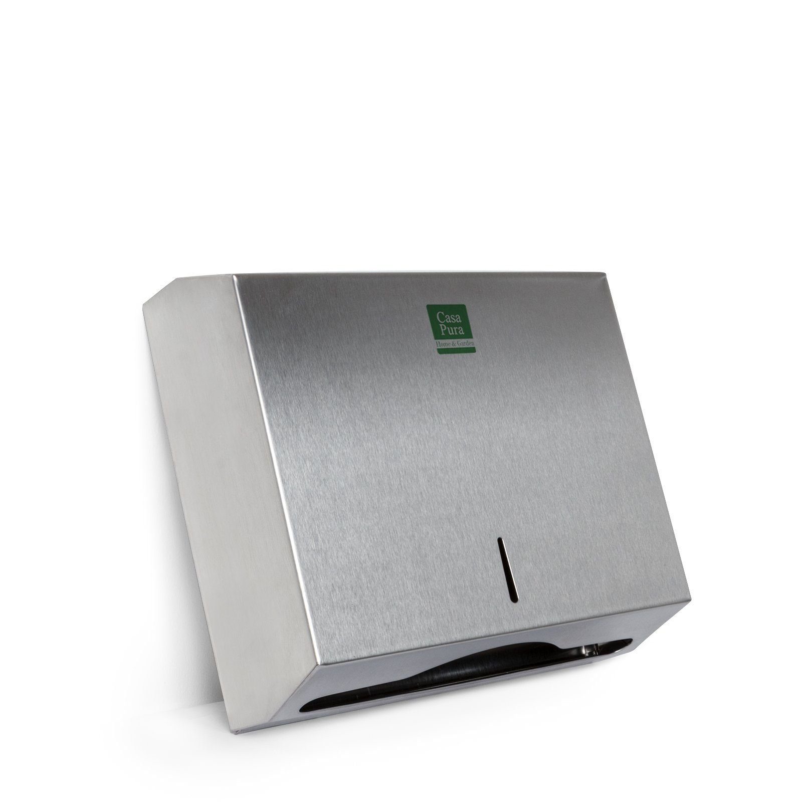 Der Papierhandtuchspender aus rostfreiem Edelstahl bietet sich in idealer Weise für eine Nutzung in öffentlich zugänglichen Sanitärräumen, Werkstätten oder auch Industriehallen an. Sie haben die Wahl, denn dieses Produkt zeigt sich in zwei verschiedenen Größen erhältlich. Bestückt werden kann der robuste und hygienische Papierspender daher entweder mit bis zu 400 oder mit bis zu 550 Papierhandtüchern mit V- oder Z-Falz. Somit ist er in der Lage, auch größere Besuchermengen zu bewältigen. Die gut dimensionierte Öffnung gewährleistet dabei stets eine bequeme Entnahme der Handtücher. Dank des verwendeten Materials zeigt sich Handtuchspender pflegeleicht, auch gröbere Verschmutzungen lassen sich von der glatten Edelstahloberfläche leicht entfernen.