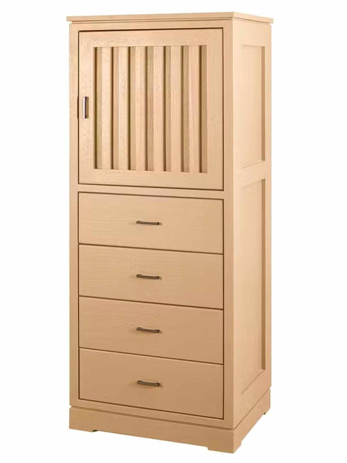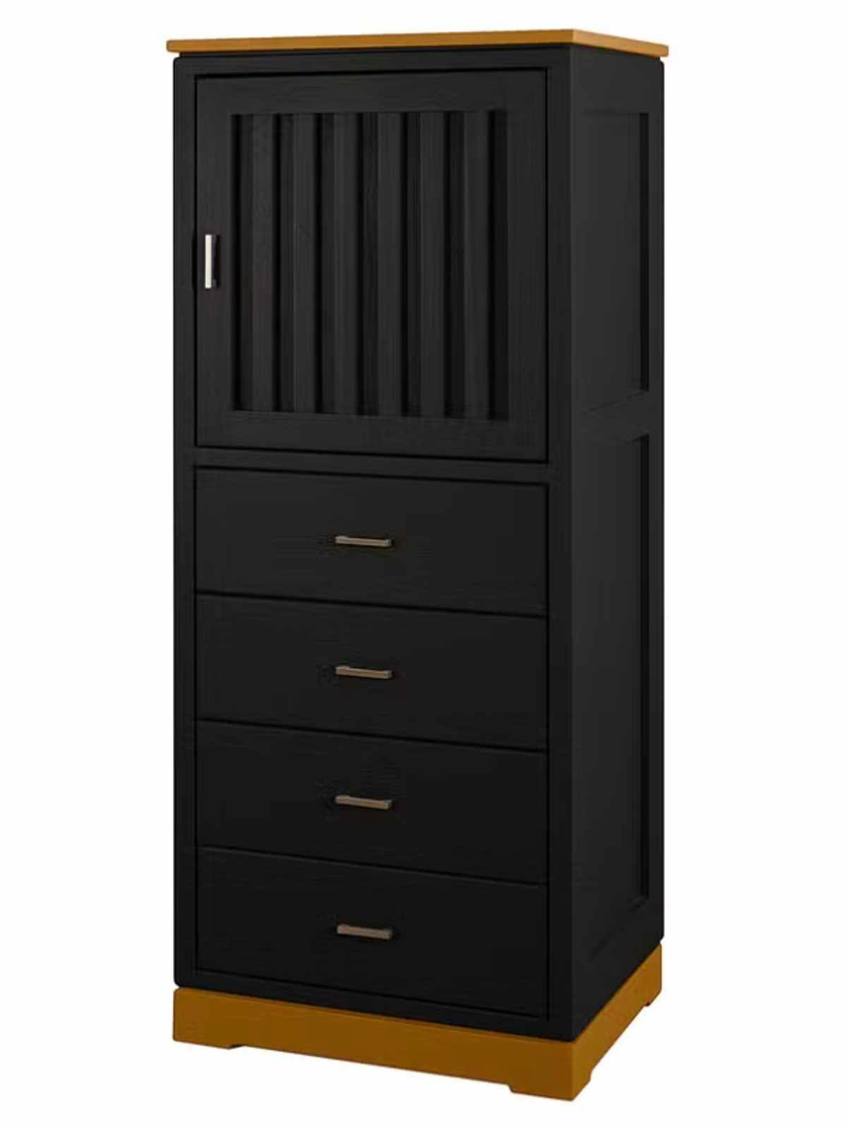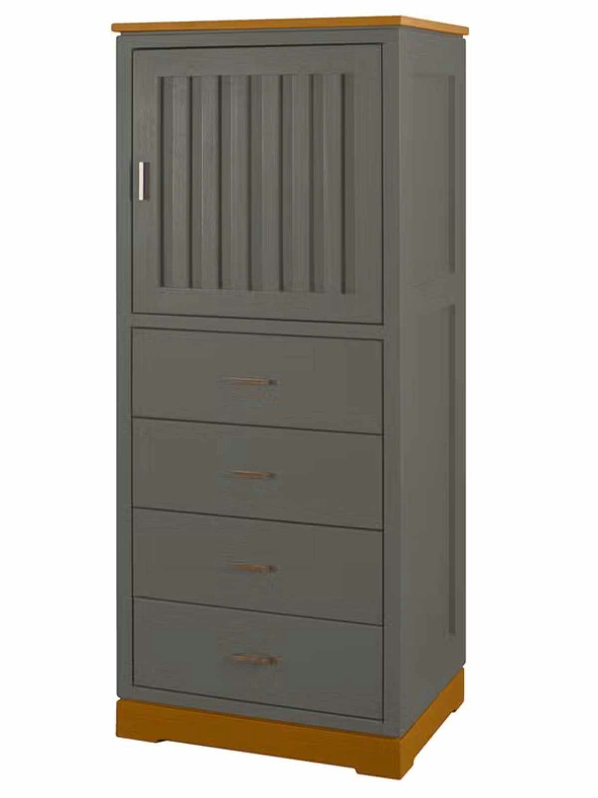 hochwertige Tür mit geriffelter Füllung, dahinter je ein Holzeinlegeboden, 4 Schubladen mit glatten Fronten