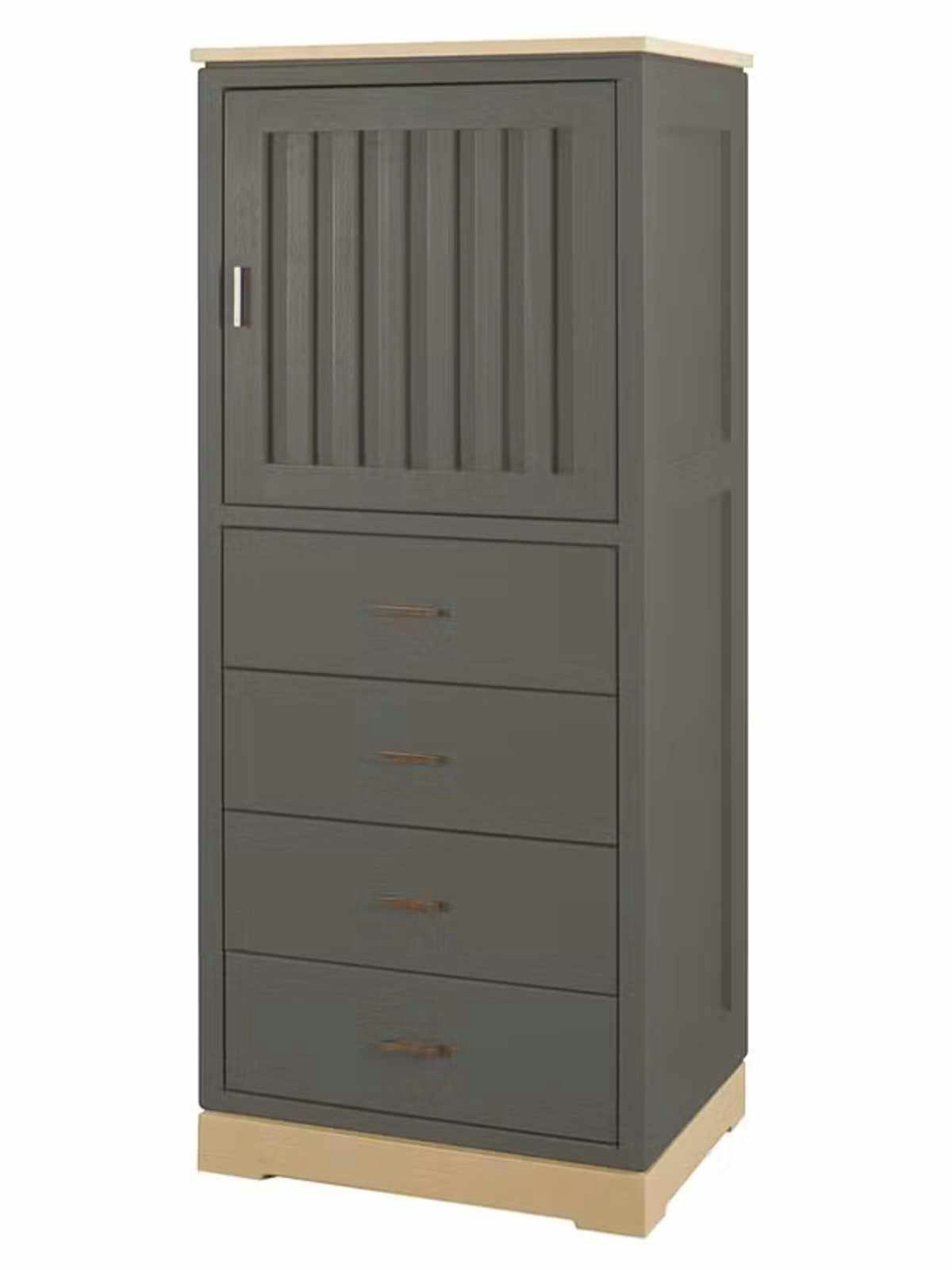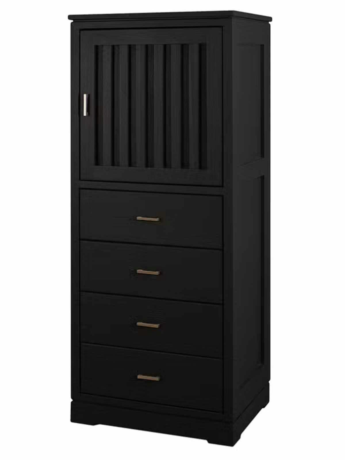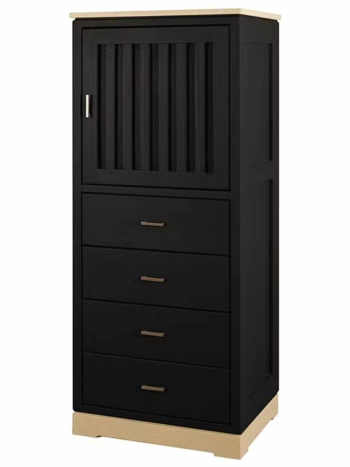 hochwertige Tür mit geriffelter Füllung, dahinter je ein Holzeinlegeboden, 4 Schubladen mit glatten Fronten
