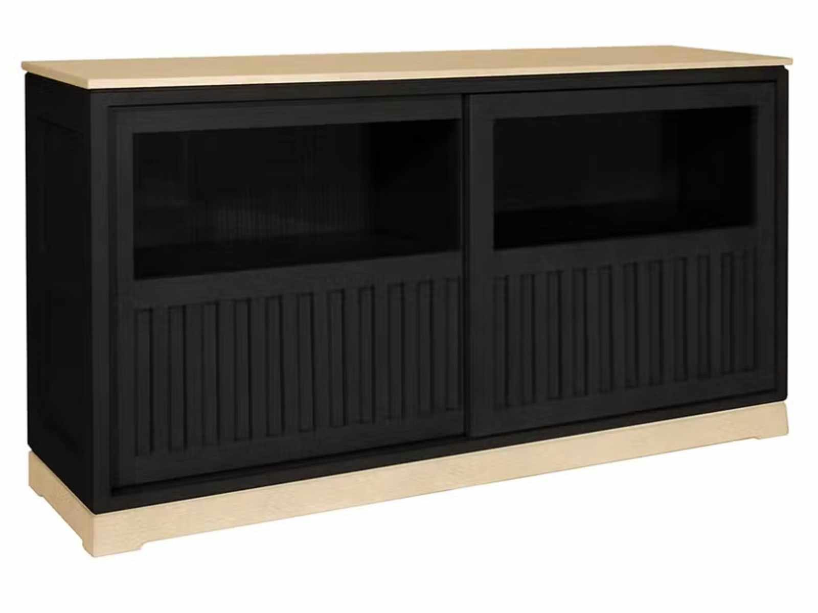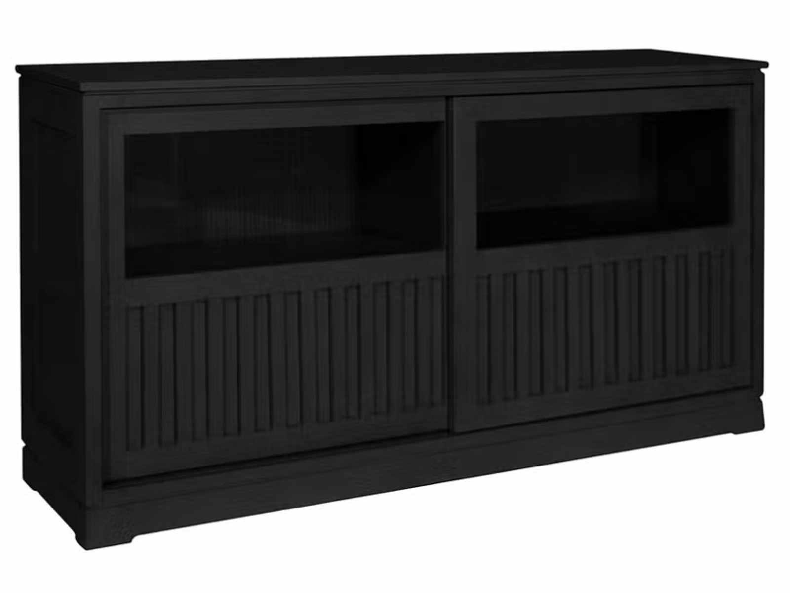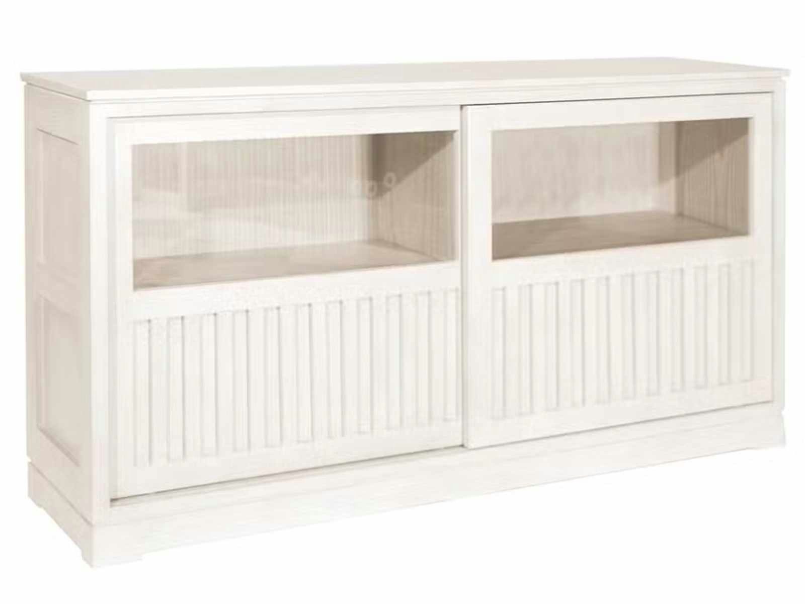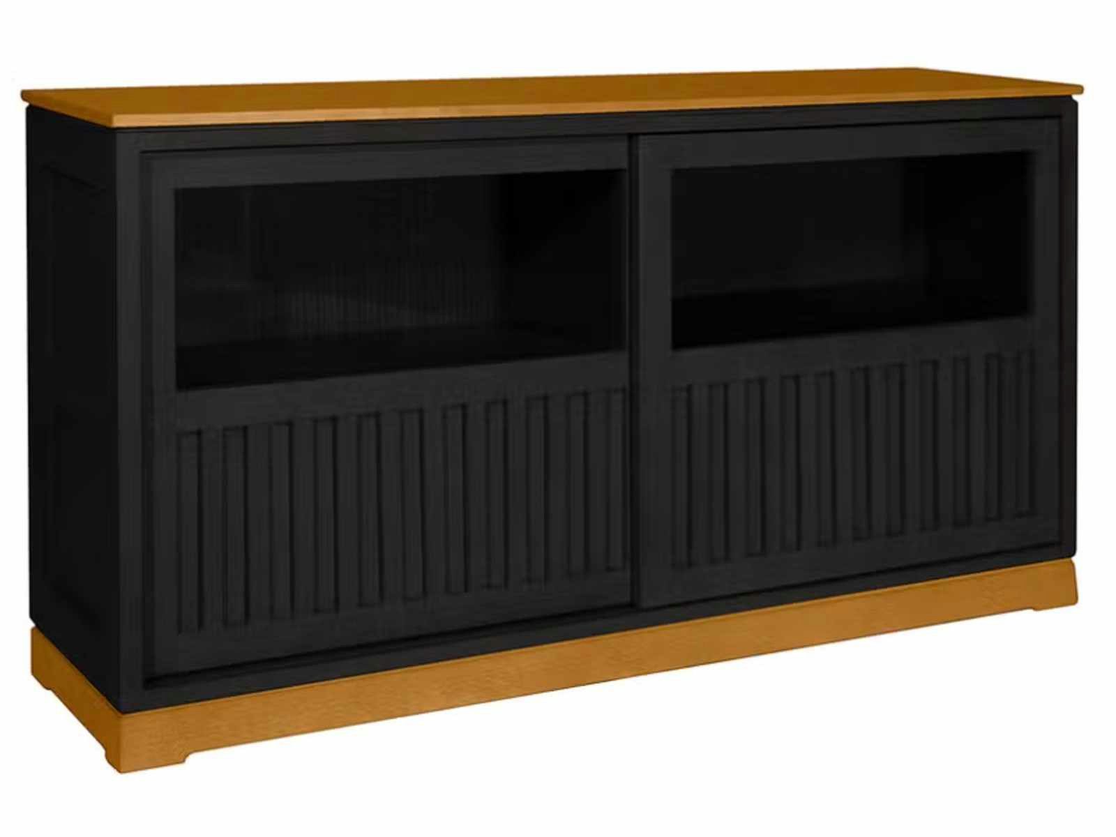 links und rechts hochwertige Schiebetüren mit geriffelter Füllung, dahinter je ein Holzeinlegeboden