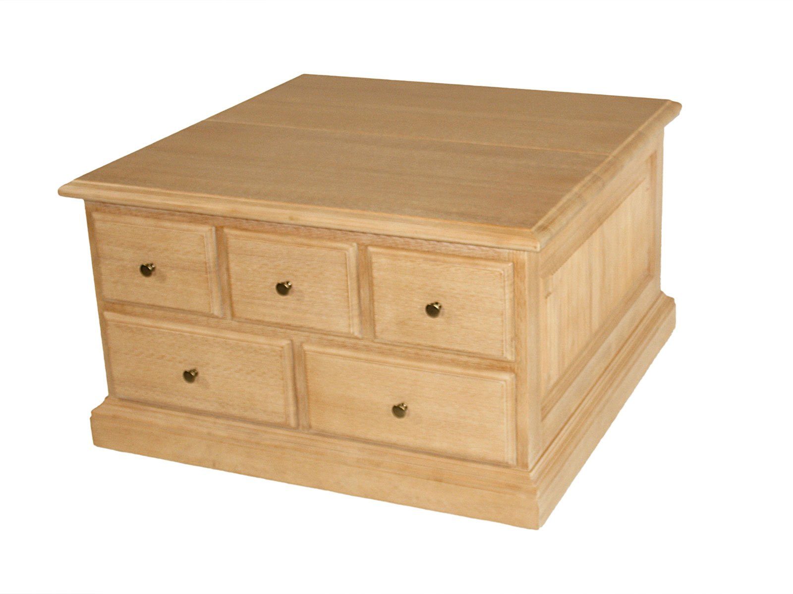 1 Seite: 5 Schubladen mit Metallknopf auf Holzleisten geführt, davon 2 große Holzschübe mit Innenmaß: B 32 x T 33 x H 13 cm