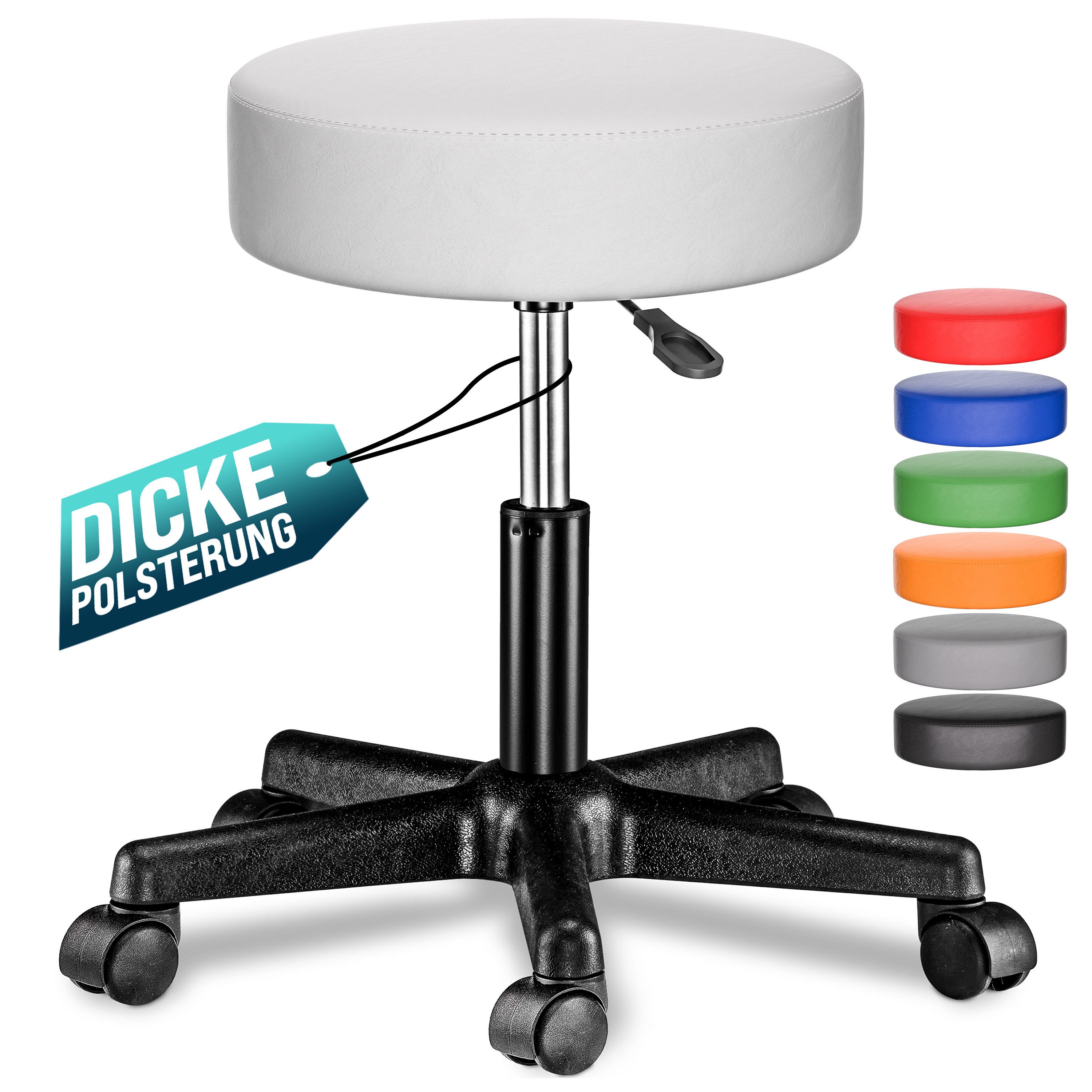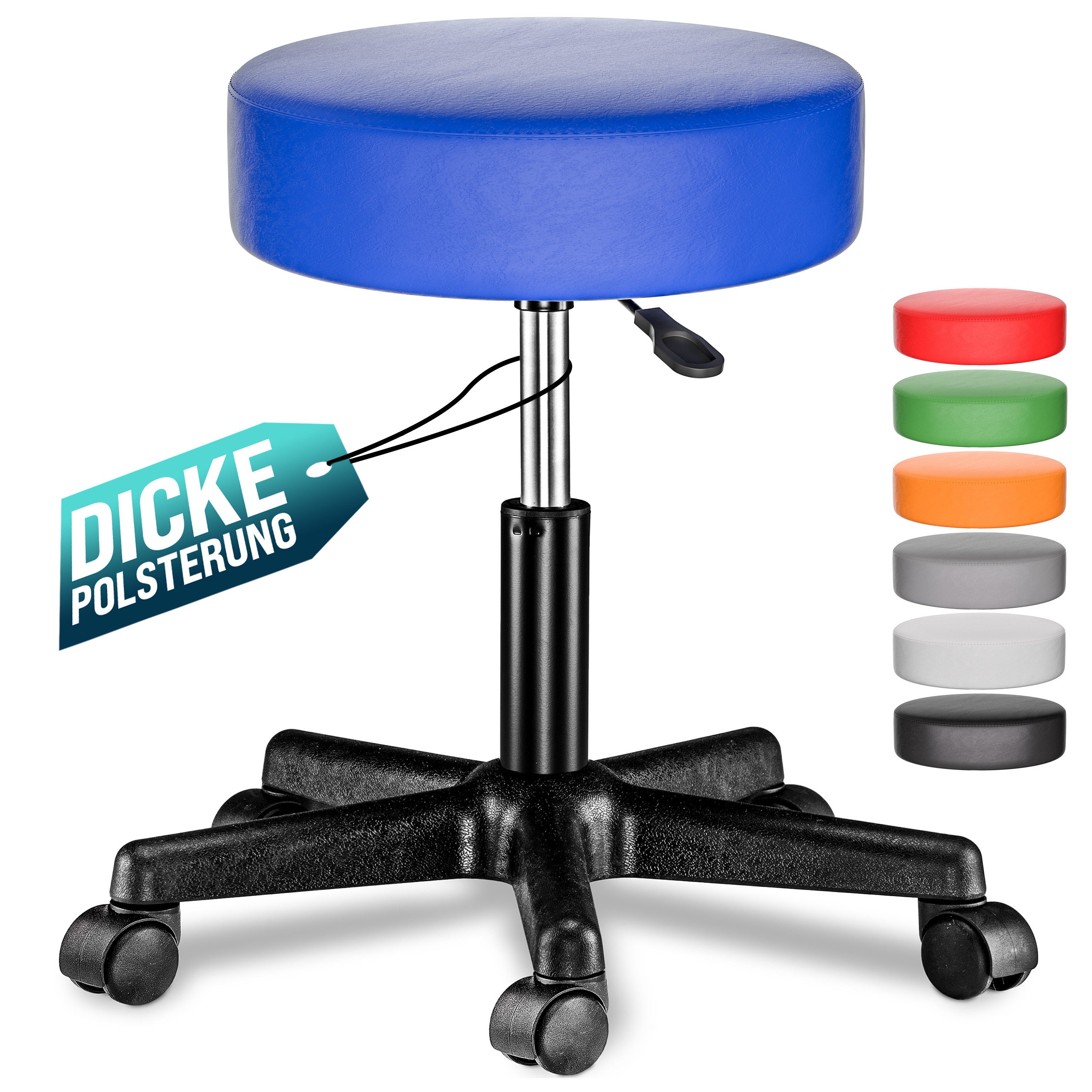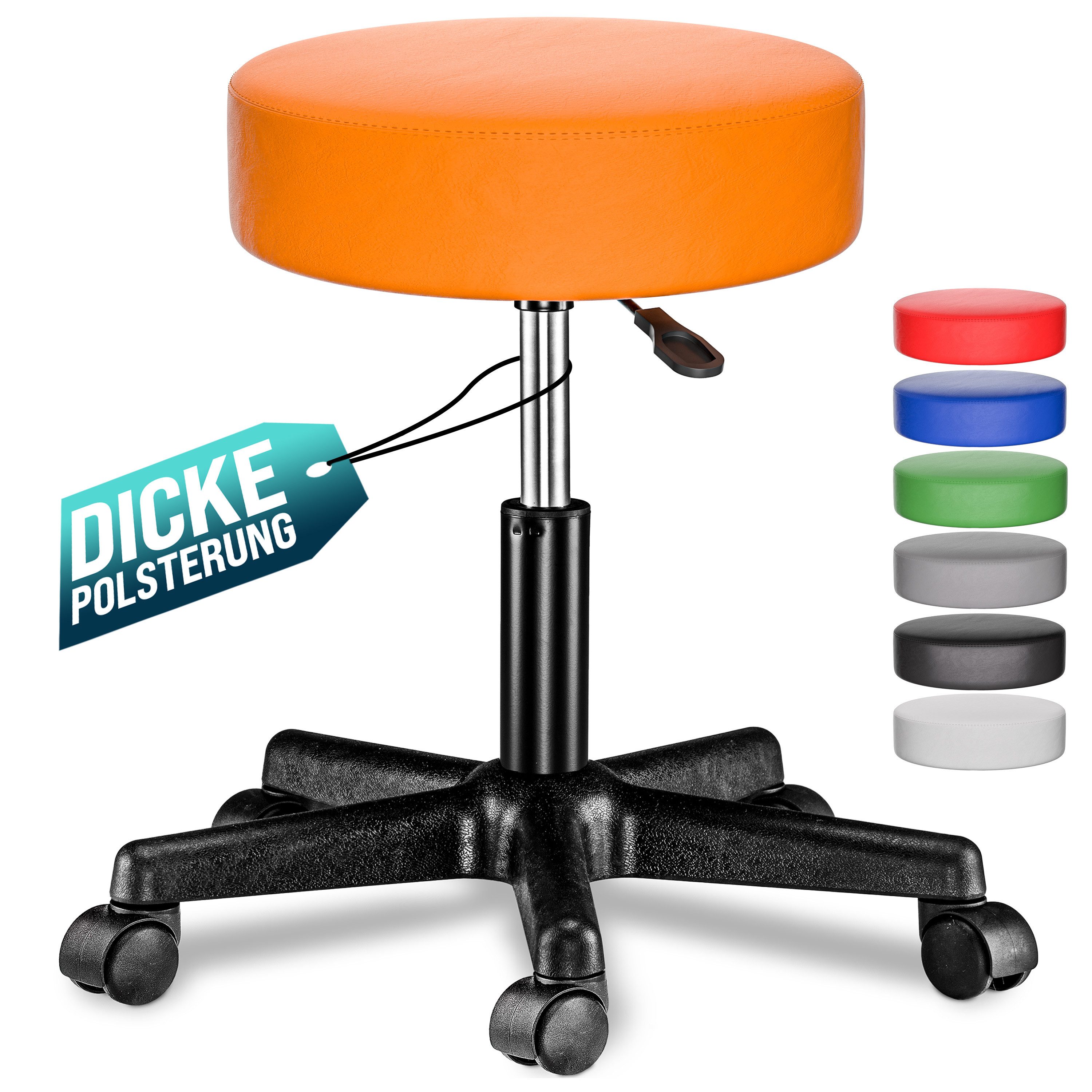 Maximaler Komfort, volle Flexibilität und müheloses Bewegen: der höhenverstellbare Rollhocker von CASARIA® passt sich deinem Alltag perfekt an. Die 10cm dick gepolsterte Sitzfläche sorgt für optimalen Komfort. Der pflegeleichte Kunstlederbezug ist in den Farben Blau, Orange, Grün, Rot, Weiß, Schwarz und Grau erhältlich.