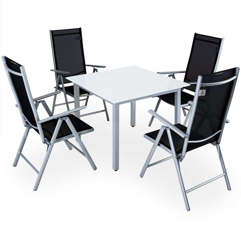 Das Gestell der Garnitur ist aus Aluminium und die Schrauben sind aus rostfreiem Edelstahl gefertigt. Das macht die Sitzgruppe extrem wetterfest. Die Tischplatte besteht aus 5mm dickem Sicherheitsglas. Die Rückenlehnen der Stühle sind in 8 Positionen verstellbar/neigbar.