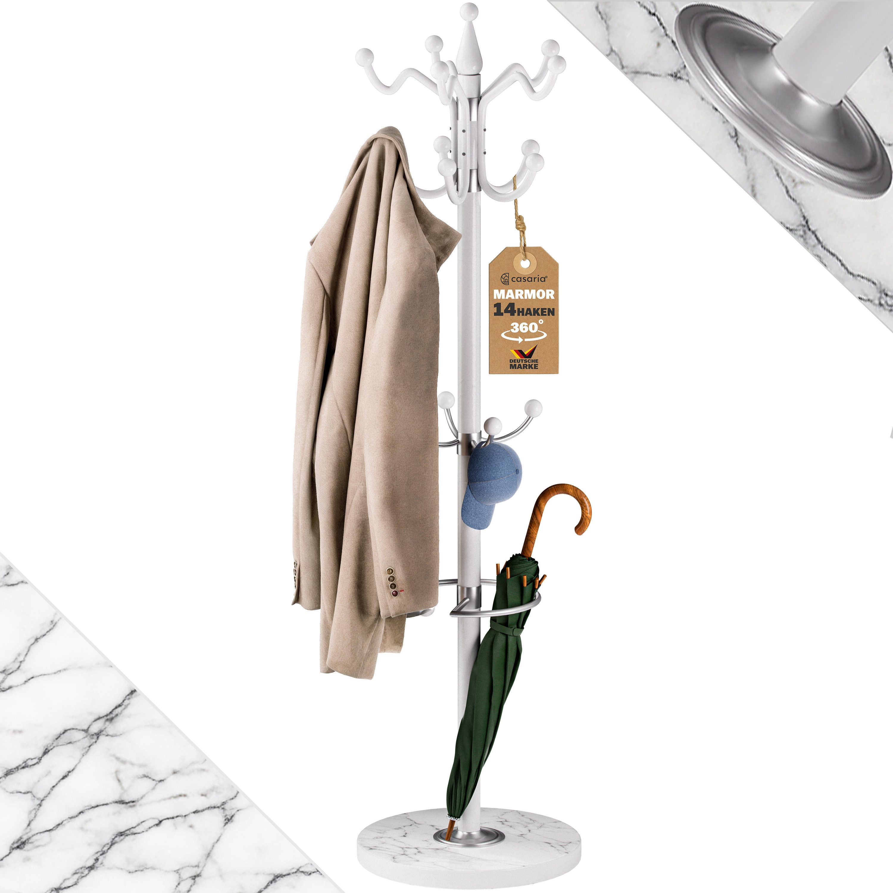 Der schwere Marmor-Sockel mit seiner einzigartigen Maserung hat einen Durchmesser von 37cm, eine Höhe von 2,4cm und sorgt für stabilen Stand. Die Garderobe ist 175cm hoch und bis 35kg belastbar. Sie ist in Weiß oder Schwarz erhältlich, einfach montiert und kann sofort verwendet werden.
