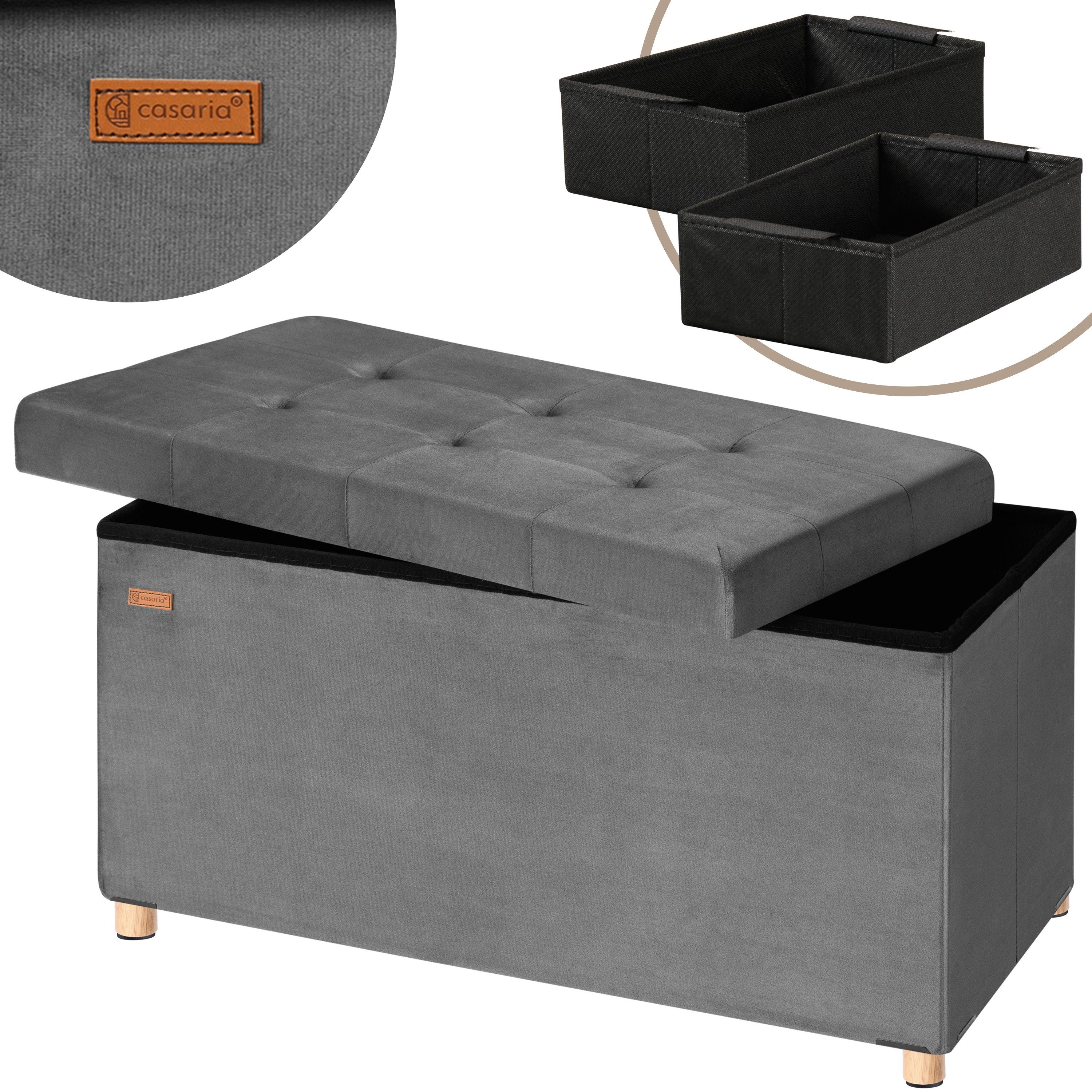 Die CASARIA® Sitztruhe aus weichem Samt begeistert durch Stil, Komfort und Funktionalität. In der Bank mit 100L Volumen können bequem Decken, Kissen und andere Utensilien verstaut werden. Der extra dicke, gepolsterte Deckel lädt zum gemütlichen Sitzen ein. Das elegante Design mit stabilen Holzfüßen verleiht jedem Wohnbereich – ob Wohnzimmer, Schlafzimmer oder Flur – das gewisse Etwas. Du kannst zwischen den Farben Rosa, Beige, Anthrazit und Grau wählen.