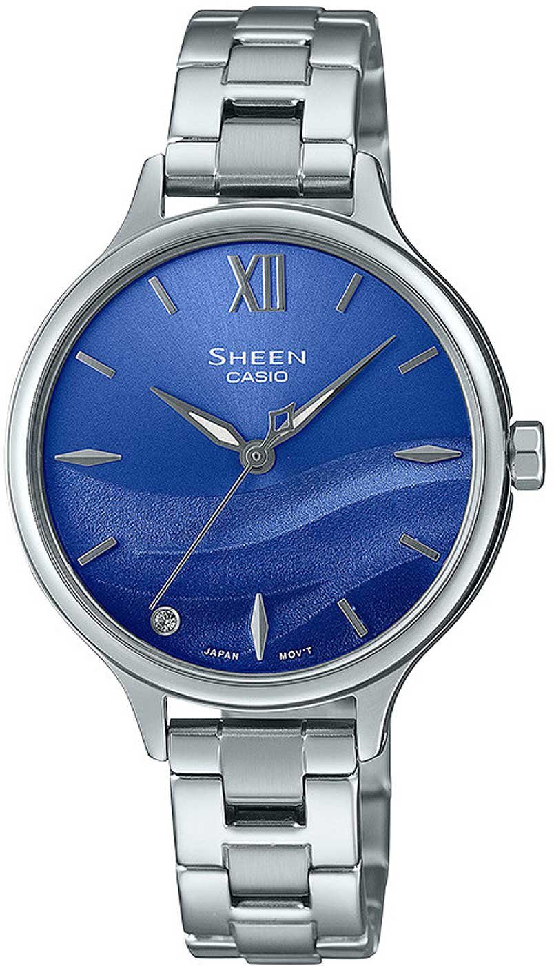 Genießen Sie die Schönheit dieser eleganten Armbanduhr, die mit einem einzigartigen Wellen-Design auf dem blauen Zifferblatt überzeugt. Ein funkelnder Kristall auf der 7-Uhr-Position setzt einen besonders markanten Akzent und verleiht dem Zeitmesser eine exquisite Note. Das hochglanzpolierte Gehäuse aus Edelstahl rundet das edle Erscheinungsbild perfekt ab und macht diese Uhr zu einem stilvollen Begleiter für jeden Anlass.