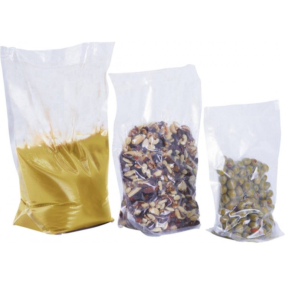 Ausstattung | Geeignet für SousVide und Mikrowelle Wiederverwendbar und spülmaschinenfest Rippenstruktur für optimales Vakuum Set mit 25 verschiedenen Beuteln Kochfest bis 100 °C für max. 8 Std. |