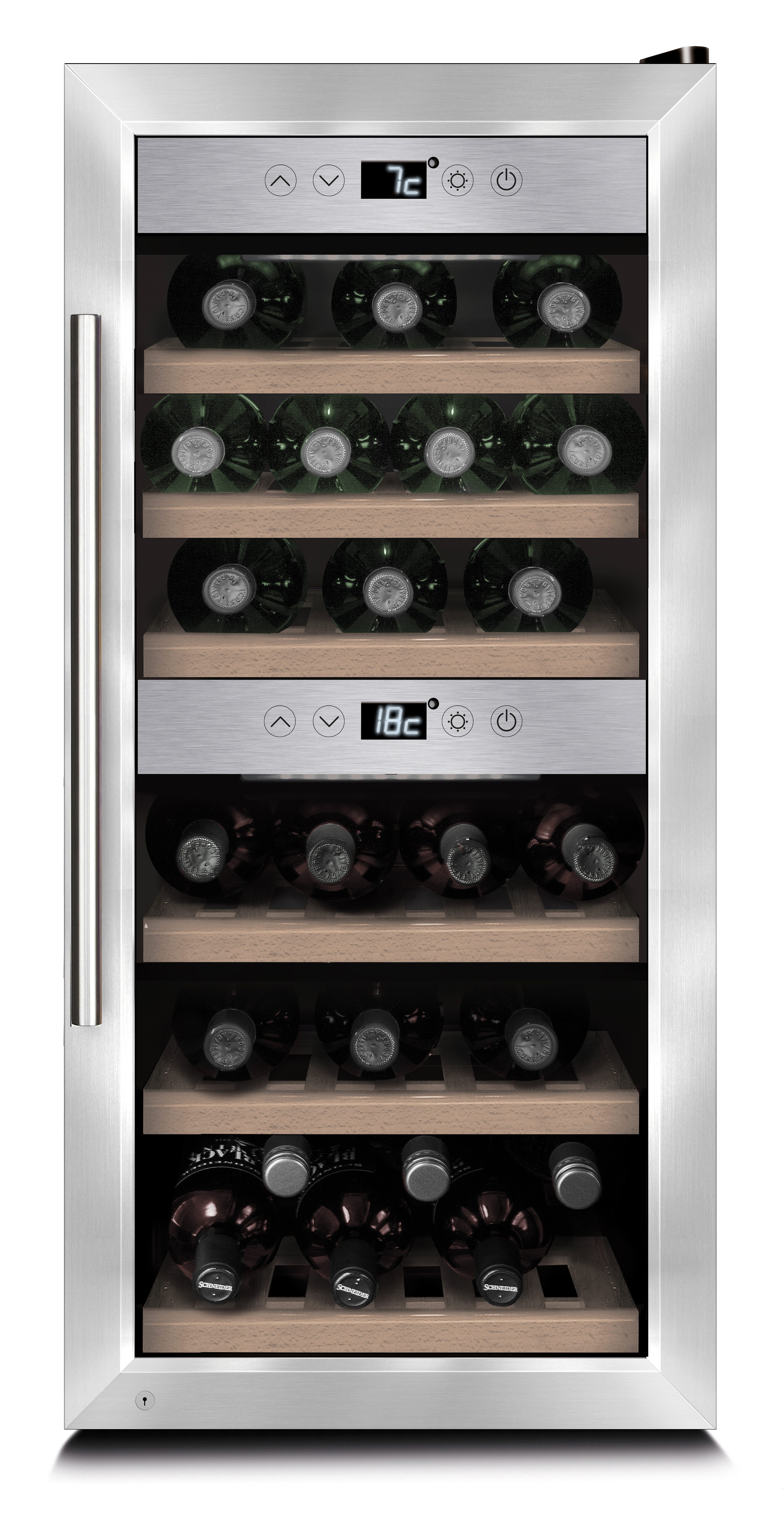 Впередe Vorteile | Das Gerät kann bis zu 24 Flaschen lagern und verfügt über ein 3-lagiges Isolier-Sicherungsglas mit UV-Filter für optimalen Aromaschutz. Der hochwertige Weinkühlschrank mit Kompressortechnik bietet zwei getrennte, individuell regelbare Temperaturzonen für Weiß- und Rotwein. Die Temperatur ist elektronisch einstellbar von 5-20°C (41-68°F) Laufruhige Kompressoren auf schwingungsreduzierten Füßen sorgen für eine geräuscharme Lagerung, während aktive Lüfter eine gleichmäßige Temperaturverteilung gewährleisten. Впередe Features sind die Sensor-Touch Steuerung, eine LED Temperaturanzeige, eine zuschaltbare Innenraumbeleuchtung, eine abschließbare Tür und ein elegantes Design mit Edelstahlfront und -griff. Über die CASO-App und das integrierte Wi-Fi Modul lässt er sich bequem von überall steuern und überwacht. |