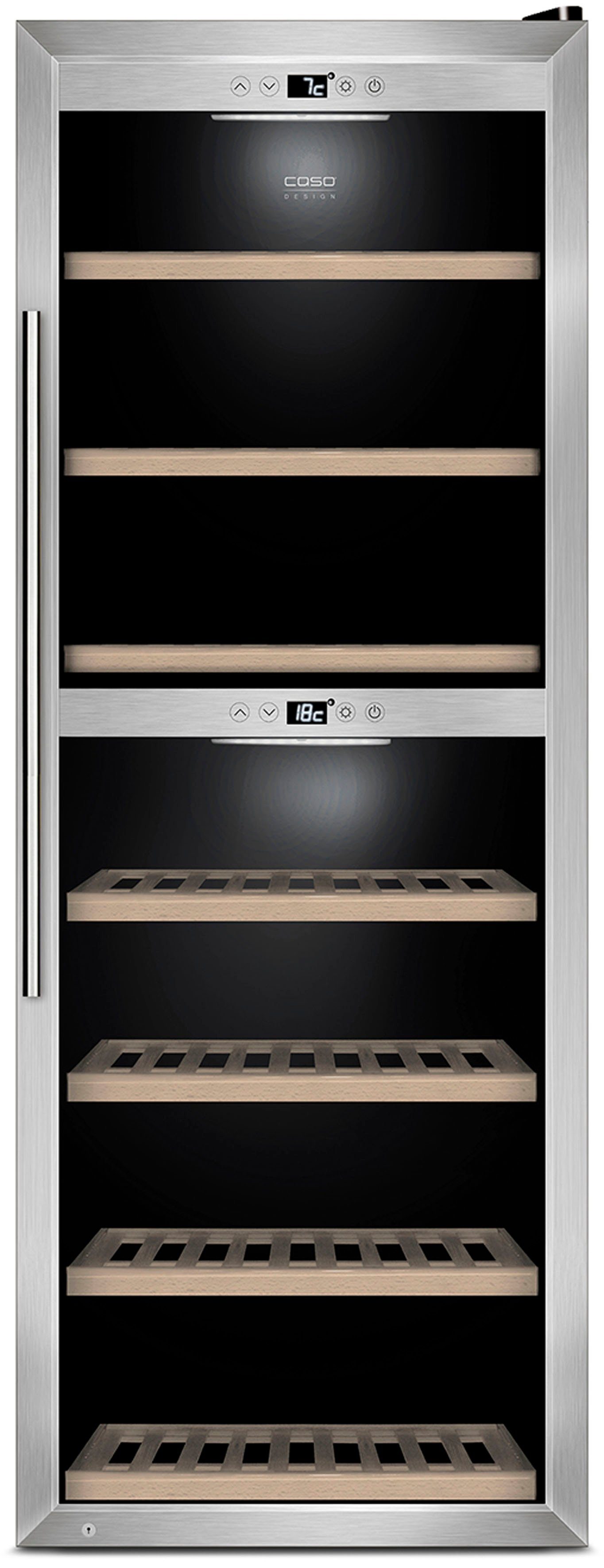 Впередe Vorteile | Dank 2 getrennter Klimazonen ist die Lagerung von mehreren Weinflaschen bestens geeignet. Ob Weiß- oder Rotwein: Für jede Art ermöglicht der Weinkühlschrank eine hervorragende Temperierung. Ein höcht edles und zeitloses Design mit elegantem Edelstahl und schwarzem Gehäuse passt sich perfekt an jede Umgebung an. Über die sehr innovative Sensor-Touch Steuerung lässt sich die Temperatur in einfachen Gradstufen einstellen. Ebenfalls lässt sich die weiße Innenbeleuchtung ganz einfach ein- und ausschalten.Laufruhige Kompressoren und ein aktiver Lüfter sorgen für eine perfekte Umgebung. Super innovatives Smart-Control per CASO App: Appfunktion ermöglicht die Steuerung des Weinkühlschrankes bequem und leicht von überall. Darüber hinaus erhält der User in sekundenschnelle etwaige Fehlermeldungen. |