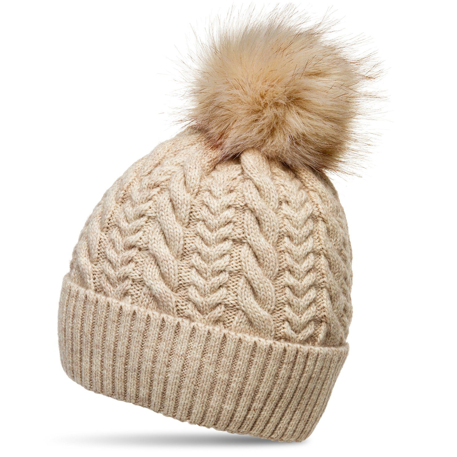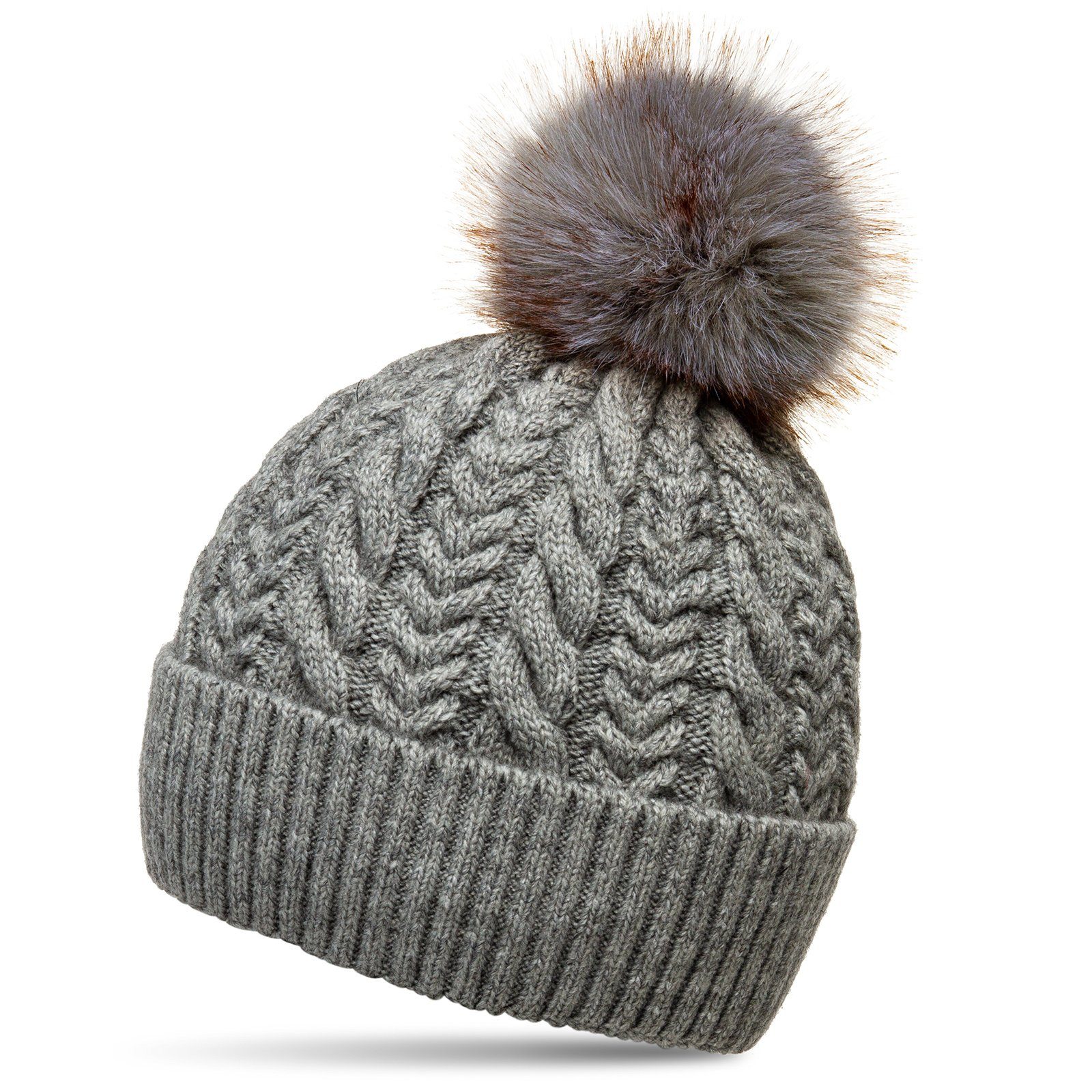 Wunderschöne, hochwertig verarbeitete Damen Strickmütze mit tierschutzgerechtem Kunstfellbommel. Die Pluspunkte dieses einzigartigen Herbst Winter Accessoires sind der kuschlig weiche XL Kunstfellbommel, das klassisch schlichte Zopf Strickmuster, die insgesamt hochwertige Materialität und Verarbeitung sowie das kuschlig weiche, sehr gut wärmende Fleece Innenfutter. Der grobe Strick ist flexibel dehnbahr, so dass sich die Mütze optimal Ihrer Kopfform anpasst und sie sich somit sehr angenehm tragen lässt. Material: 100% Acryl. Caspar Fashion.