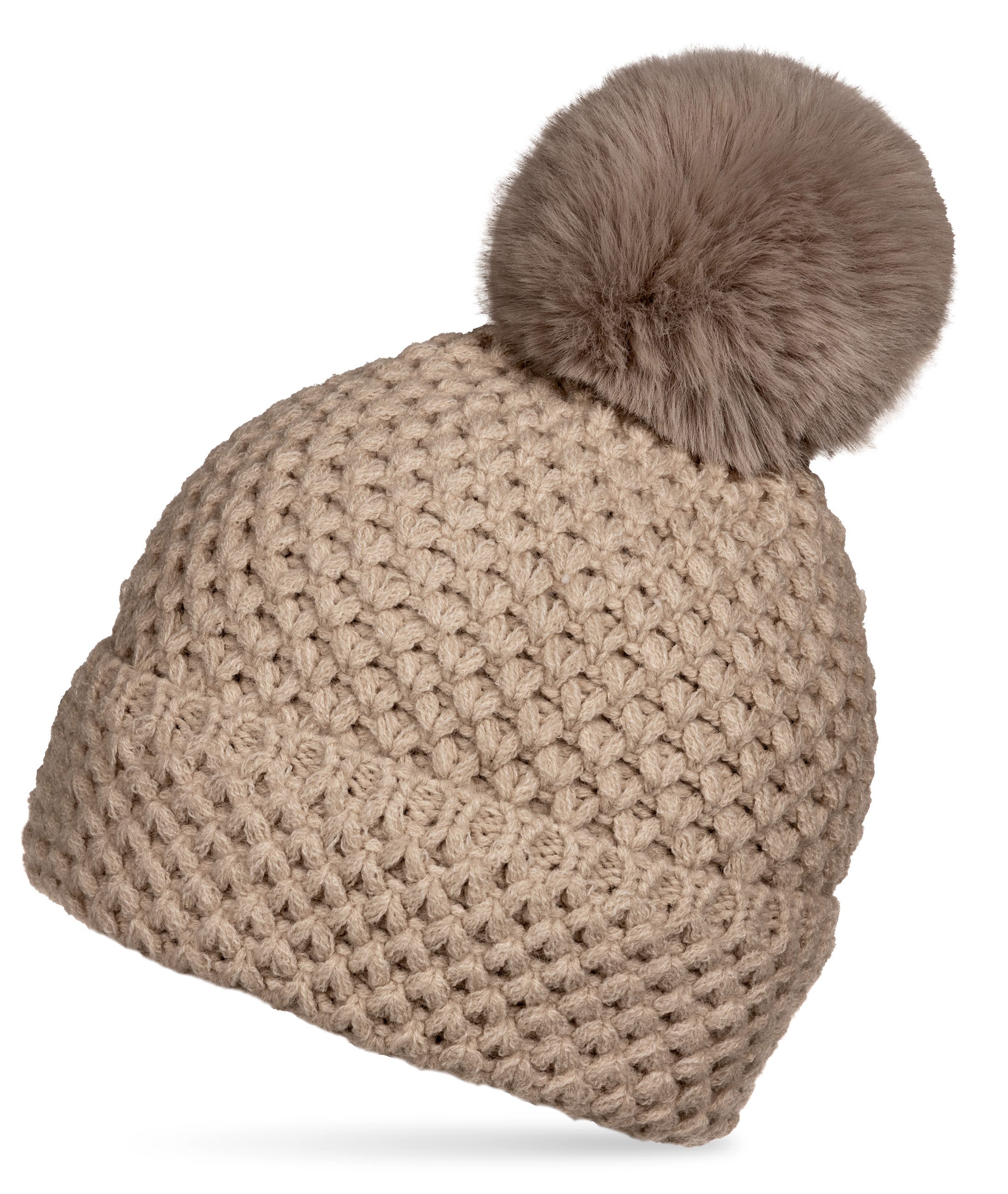 Die Mütze ist pflegeleicht und kann problemlos bei 30 Grad gewaschen werden. Nach kurzem Bürsten und kräftigem Schütteln erhält der Kunstfellbommel wieder sein volles Volumen.