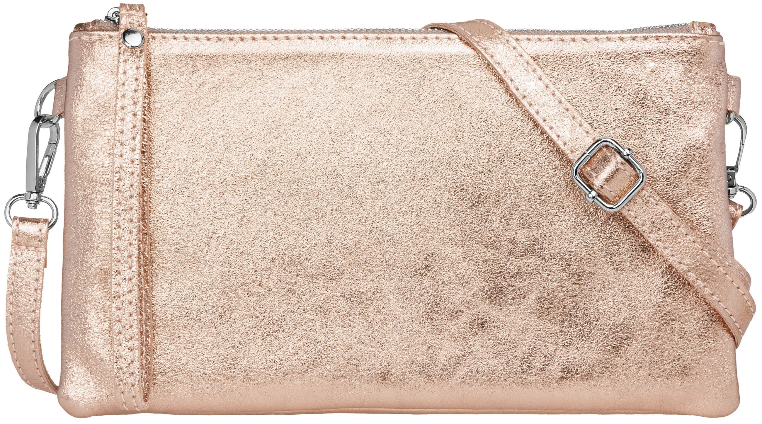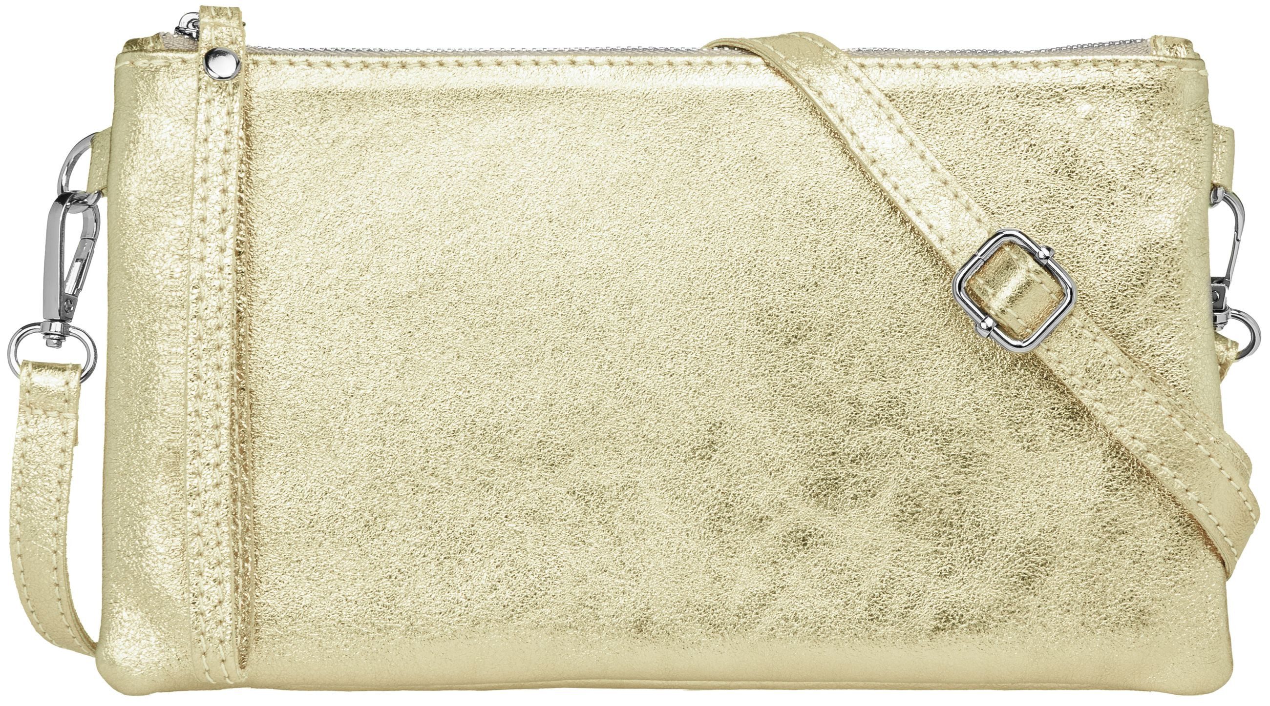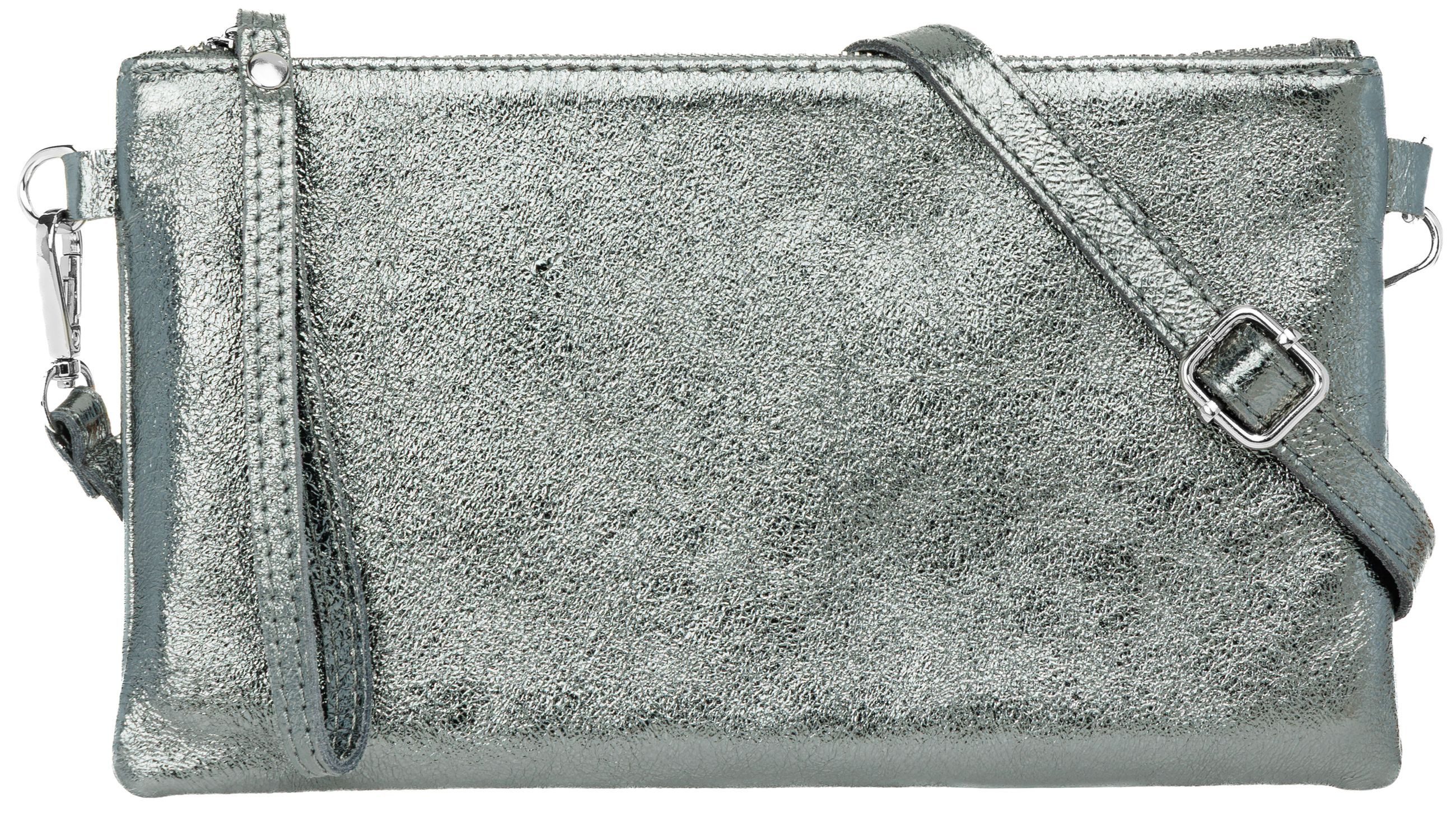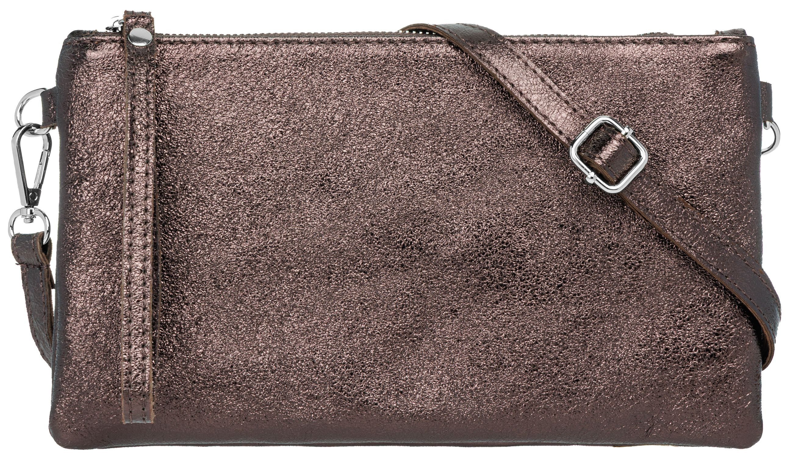Elegante Damen Clutch aus echtem Leder mit Metallic Finish. Diese Abendtasche ist der pefekte Begleiter für Ihren stilvollen abendlichen Auftritt. Sie können die Tasche mit Hilfe der abnehmbaren Handschlaufe an Handgelenk oder mit dem beiliegenden bis zu 125 cm langen Ledergurt bequem über den Schulter tragen. Die Tasche hat perfekte Abmessungen, ist nicht zu groß und nicht zu klein. Handy, Lippenstift, Geldbörse, etc. passen problemlos hinein. Das Leder ist hochwertig und robust, das Design zurückhaltend und schlicht. Mit dieser Clutch beweisen Sie Stil und Klasse! Im Innern befindet sich ein großes Hauptfach und ein seitliches Nebenfach. Geschlossen wird die kleine Umhängetasche mit einem an der oberen Kante sitzenden silberfarbenen Reißverschluss. Maße B x H x T ca. 26 x 15,5 x 1,5 cm. Material: Leder. Caspar Fashion - Made in Italy
