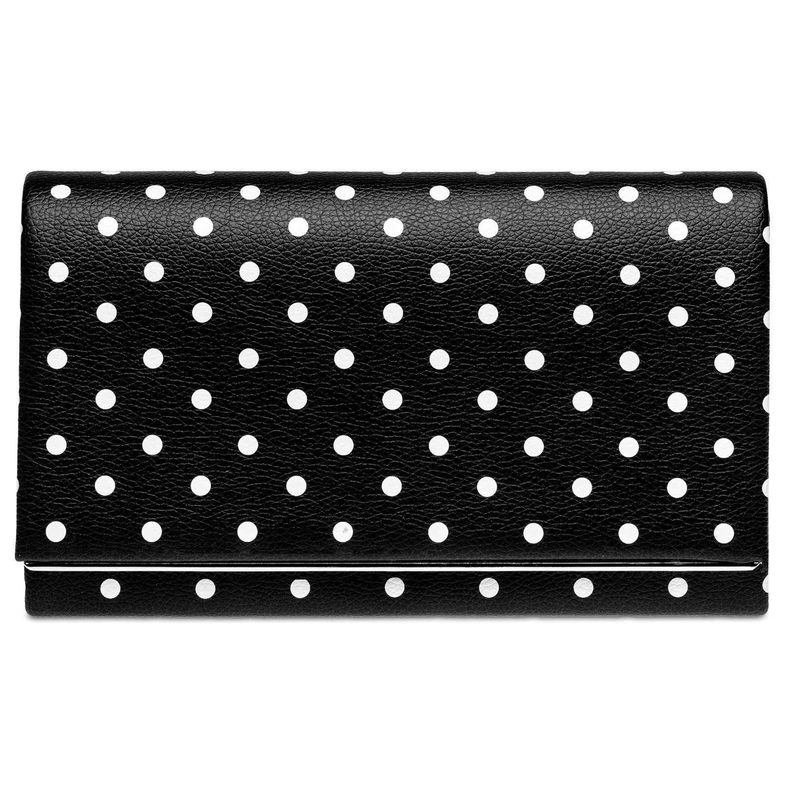 Ausgefallene Briefumschlag Überschlag Clutch Abendtasche mit optimaler Размер und verschiedenen schwarz / weiß 50er-Jahre Retro Mustern. Mit dieser Clutch beweisen Sie Stil und Klasse. Die klare, einfache Form der Clutch lässt die außergewöhnlichen Retro Muster besonders zur Geltung kommen und lässt somit dieses Accessoire zu etwas ganz Besonderem werden. Im Innern der Tasche befindet sich ein großes Hauptfach mit seitlichem Einsteckfach. Geschlossen wird die Clutch mit einem Magnetverschluss. Mit Hilfe der beiliegenden Metall Kette können Sie die Clutch bequem als Umhängetasche über der Schulter tragen. Material: Kunstleder, Maße: LxBxH ca. 22 x 5 x 13,5 cm. Caspar Fashion.