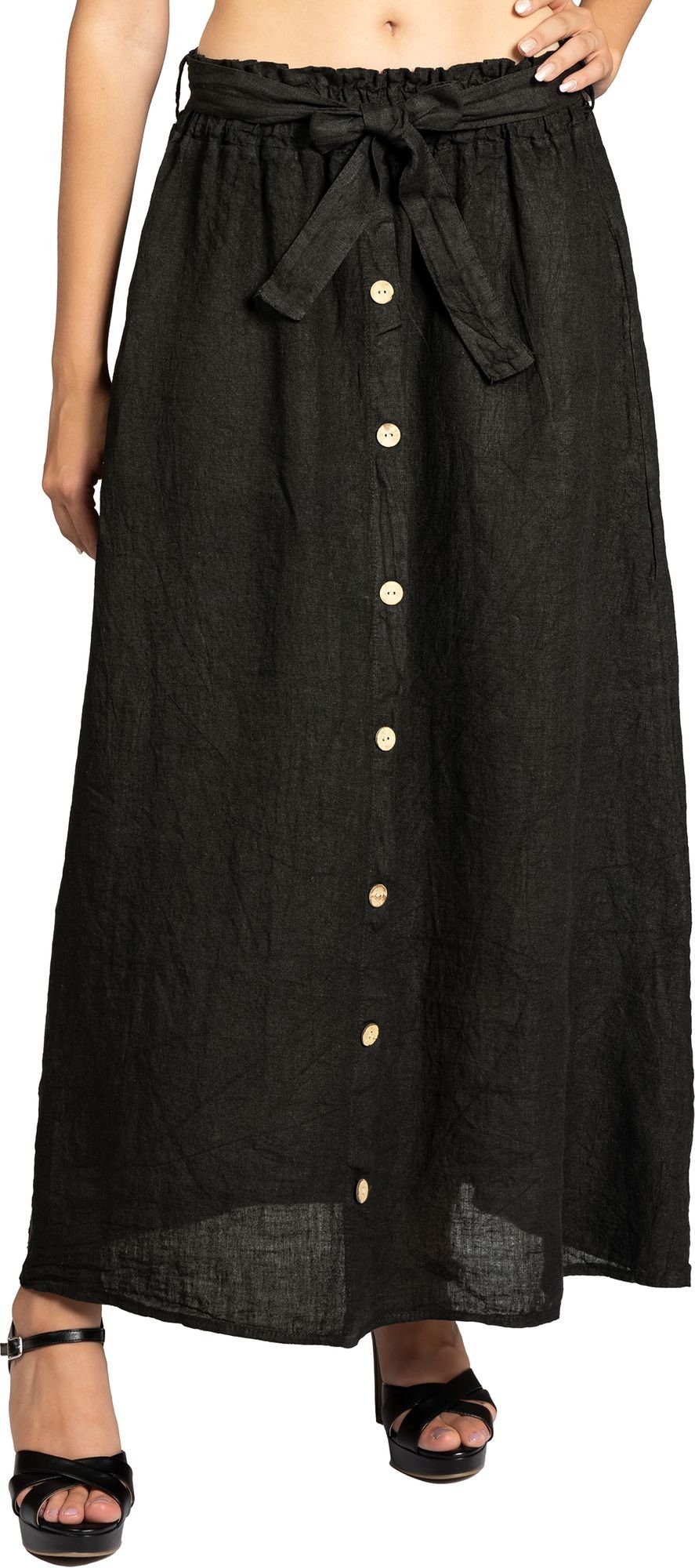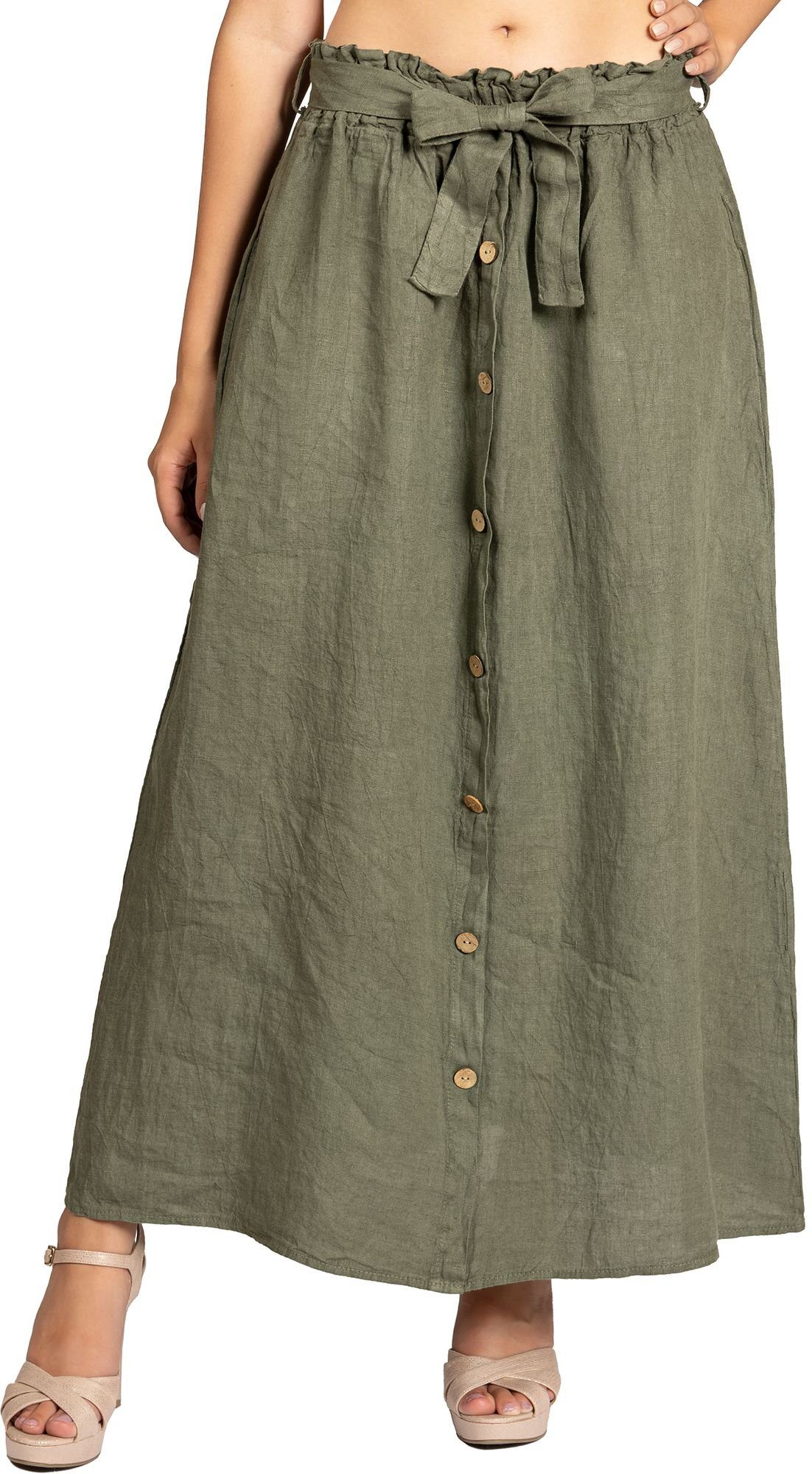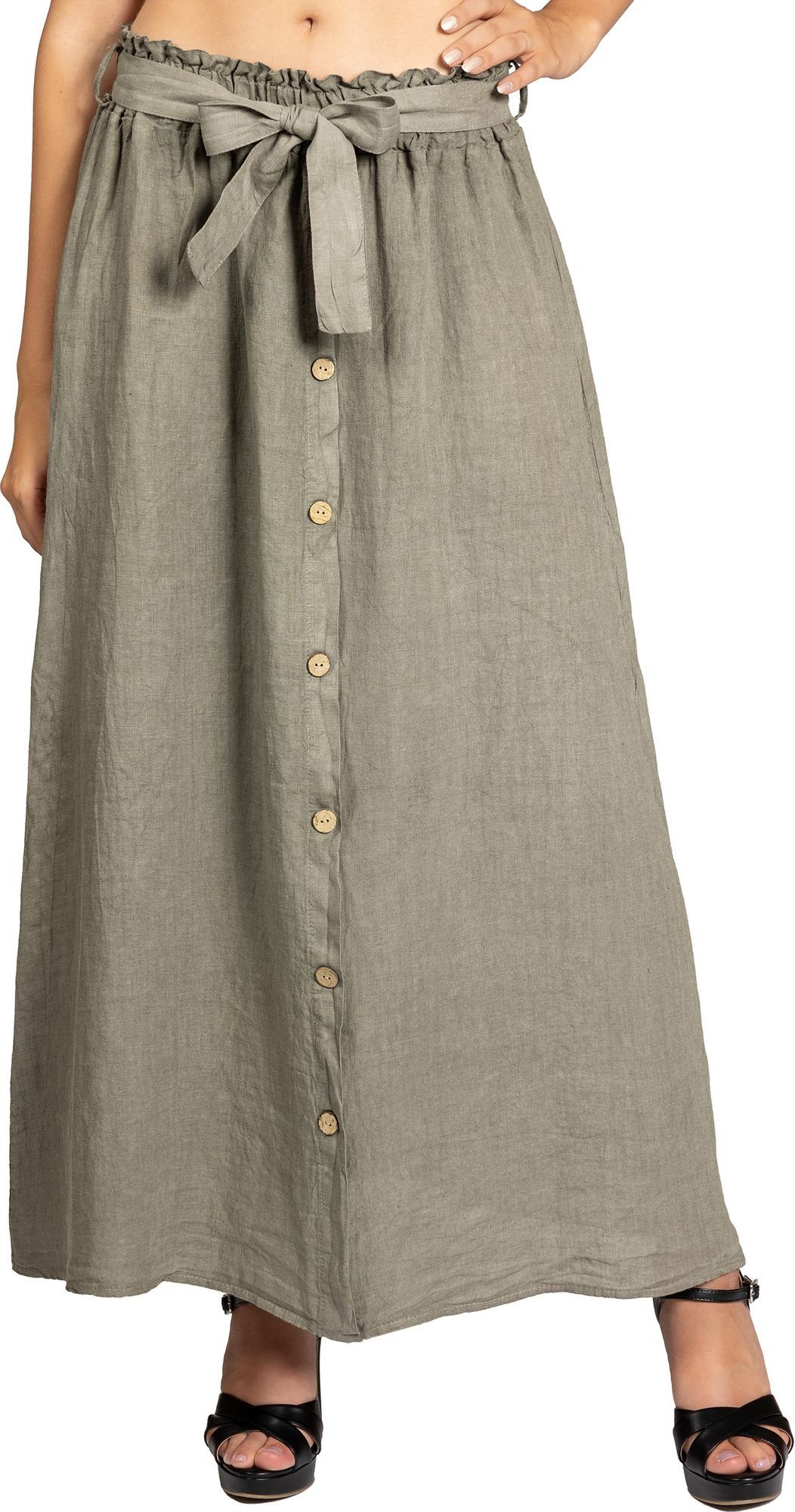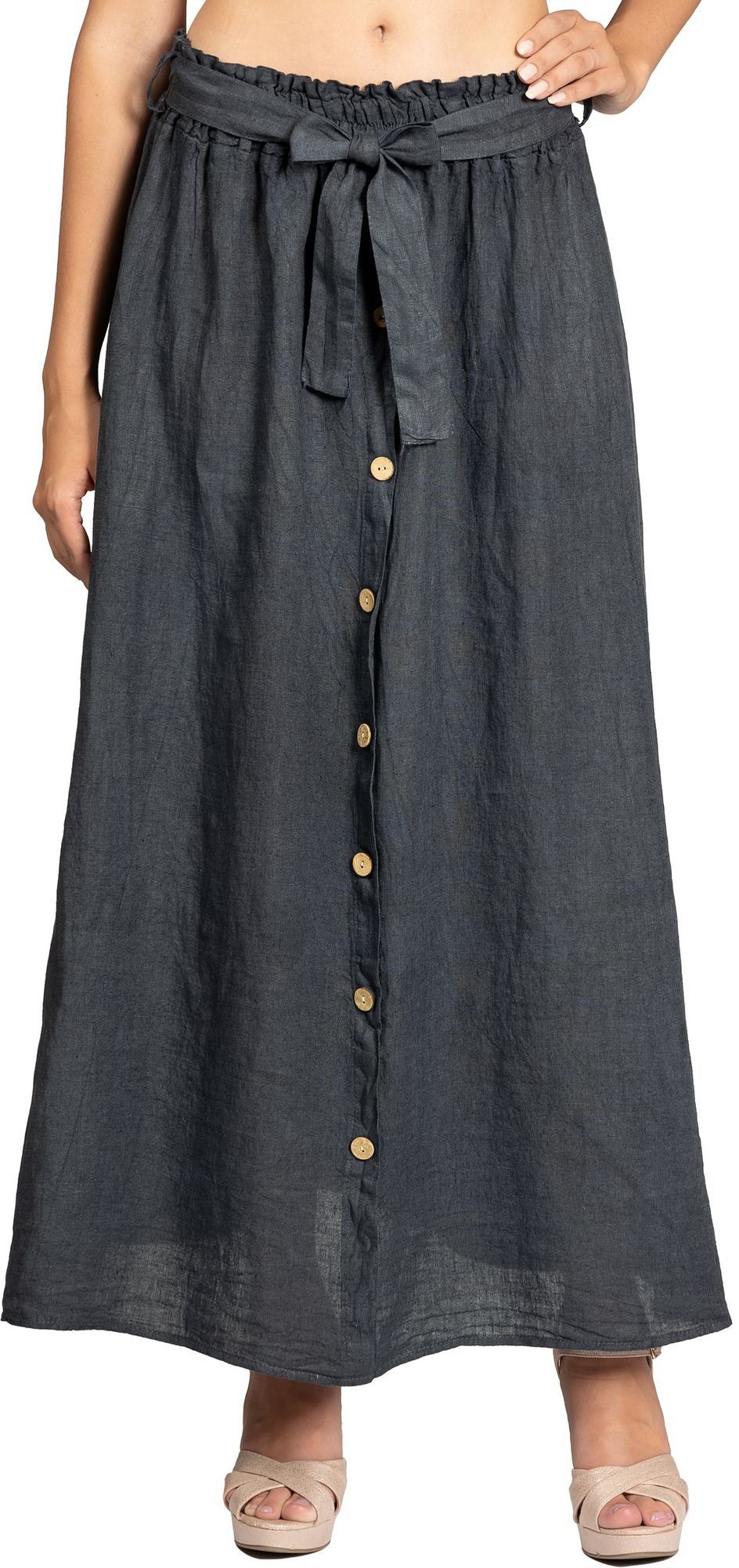 Super leichter, weicher und langer Damen Sommerrock aus italienischem Leinen mit stylischer Knopfleiste und gerafftem Bund. Der aus sommerlich luftigem und sehr angenehm zu tragenden Stoff hergestellte Maxirock ist der ideale Begleiter durch den Sommer. Das Besondere an diesem Rock ist seine schlichte und einfache Form in Kombination mit dem dezent gerafften Bund und dem sportlich eleganten Holzknöpfe Dekor auf der Vorderseite. Der Rock lässt sich daher perfekt kombinieren. Ein ca. 6 cm hoher, leicht geraffter Stretch Bund mit Gummizug passt sich ideal Ihrer Figur an und kaschiert geschickt kleine Problemzonen. Zusätzlich kann der Rock mit dem Bindeband fest gebunden werden. Die Knopfleiste ist nur Dekor und kann nicht geöffnet bzw. geschlossen werden. Material: 100% Leinen. Pflegehinweis: Maschinenwäsche bei 30 Grad - nicht Trocknergeeignet. Caspar - Made in Italy.