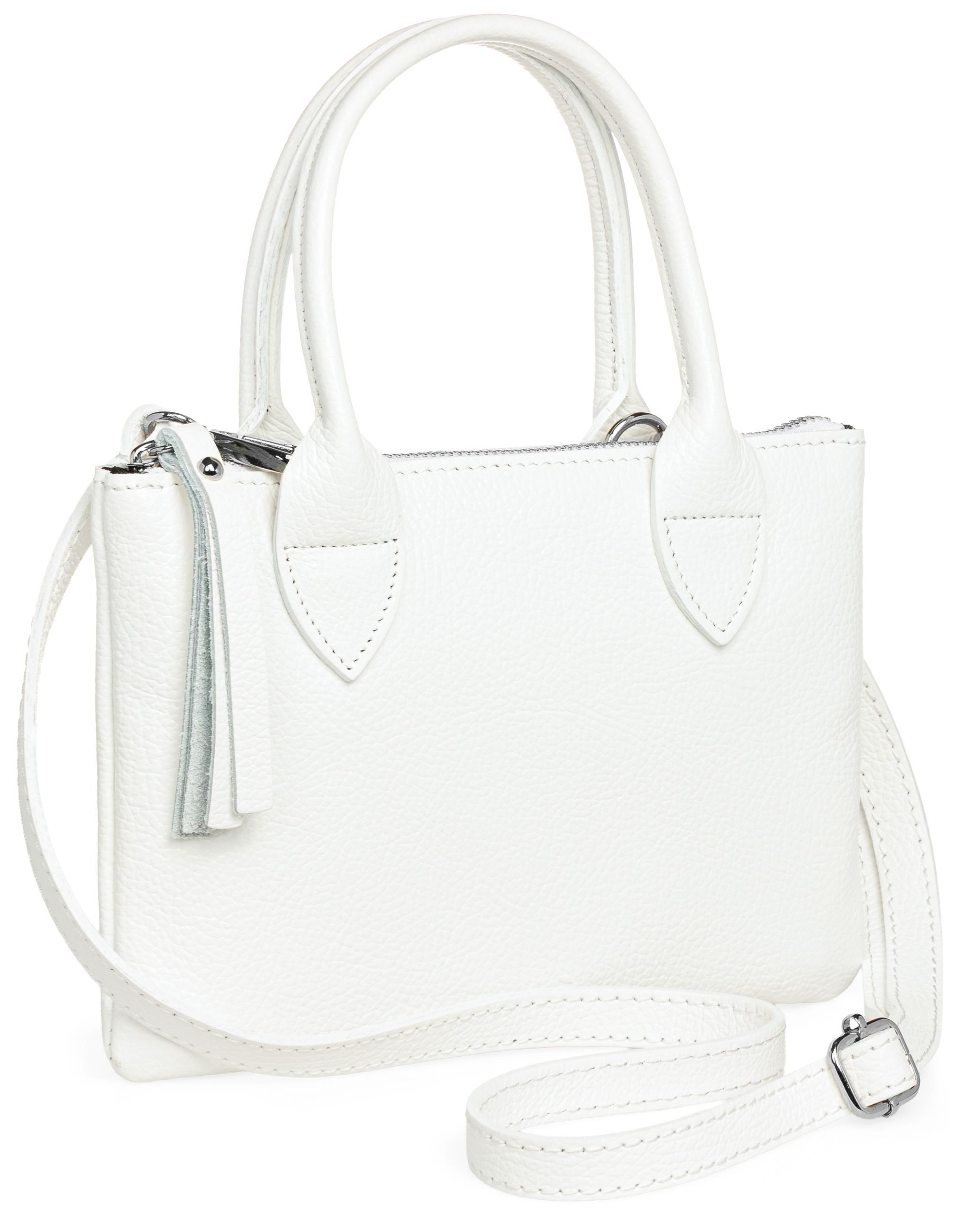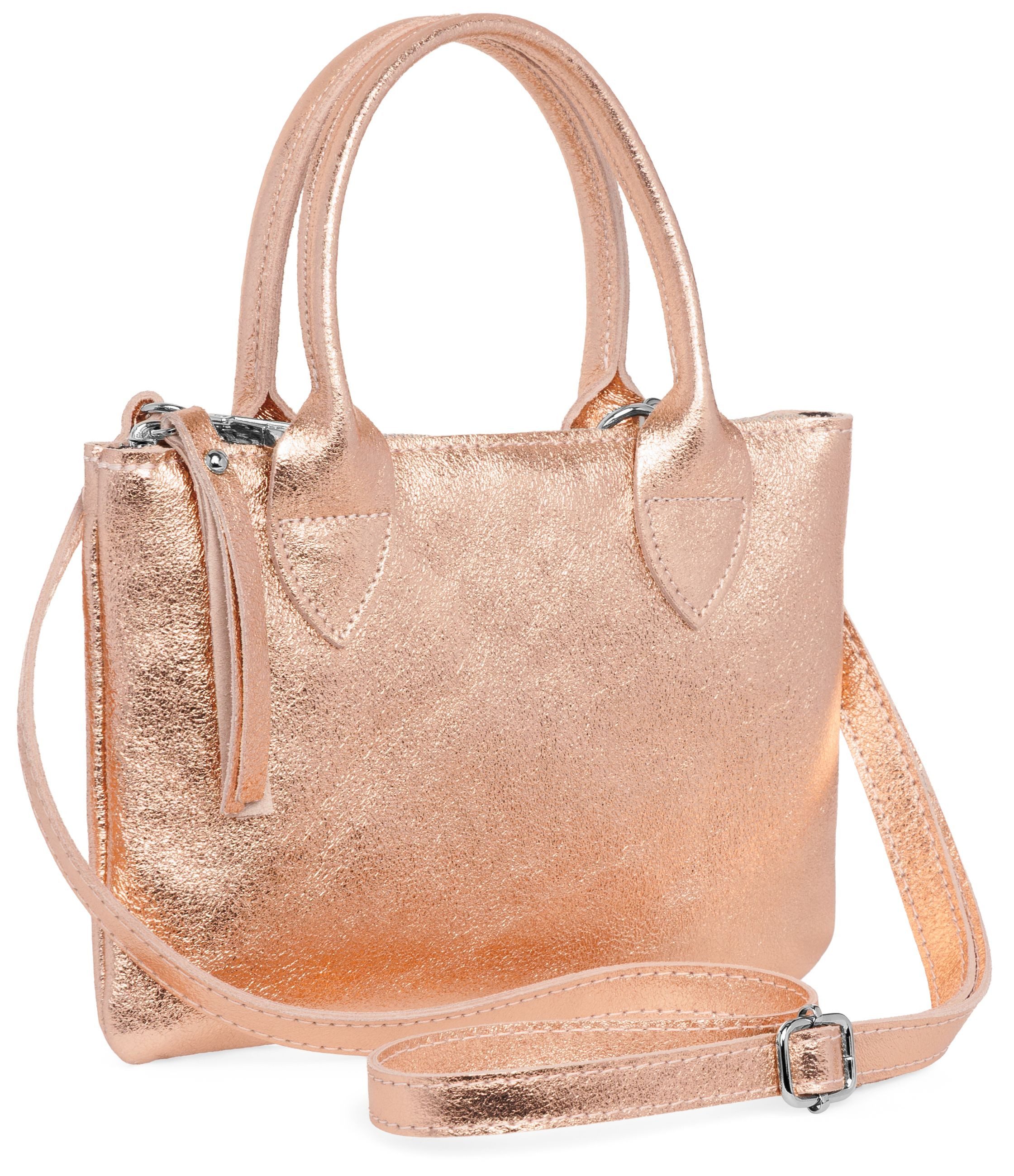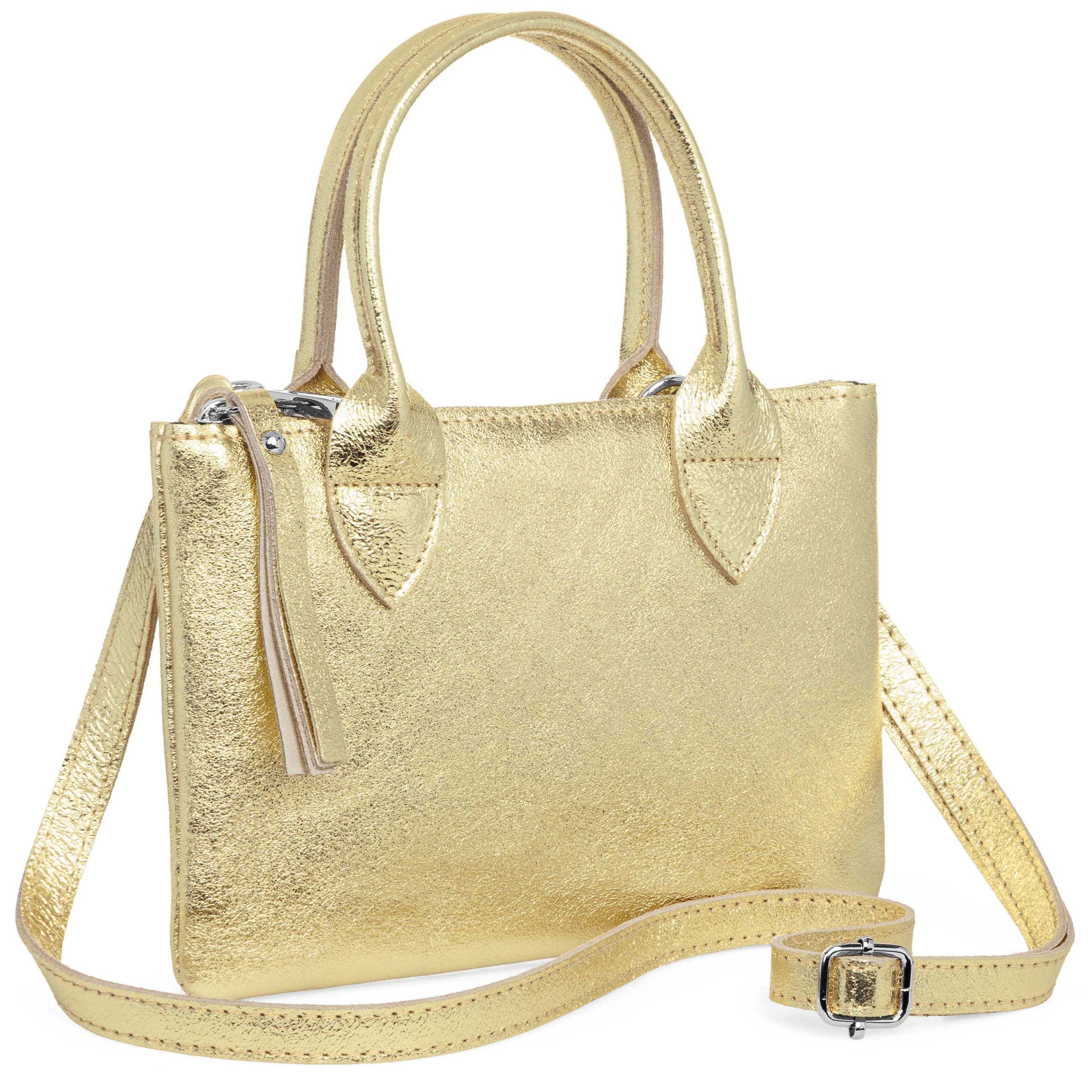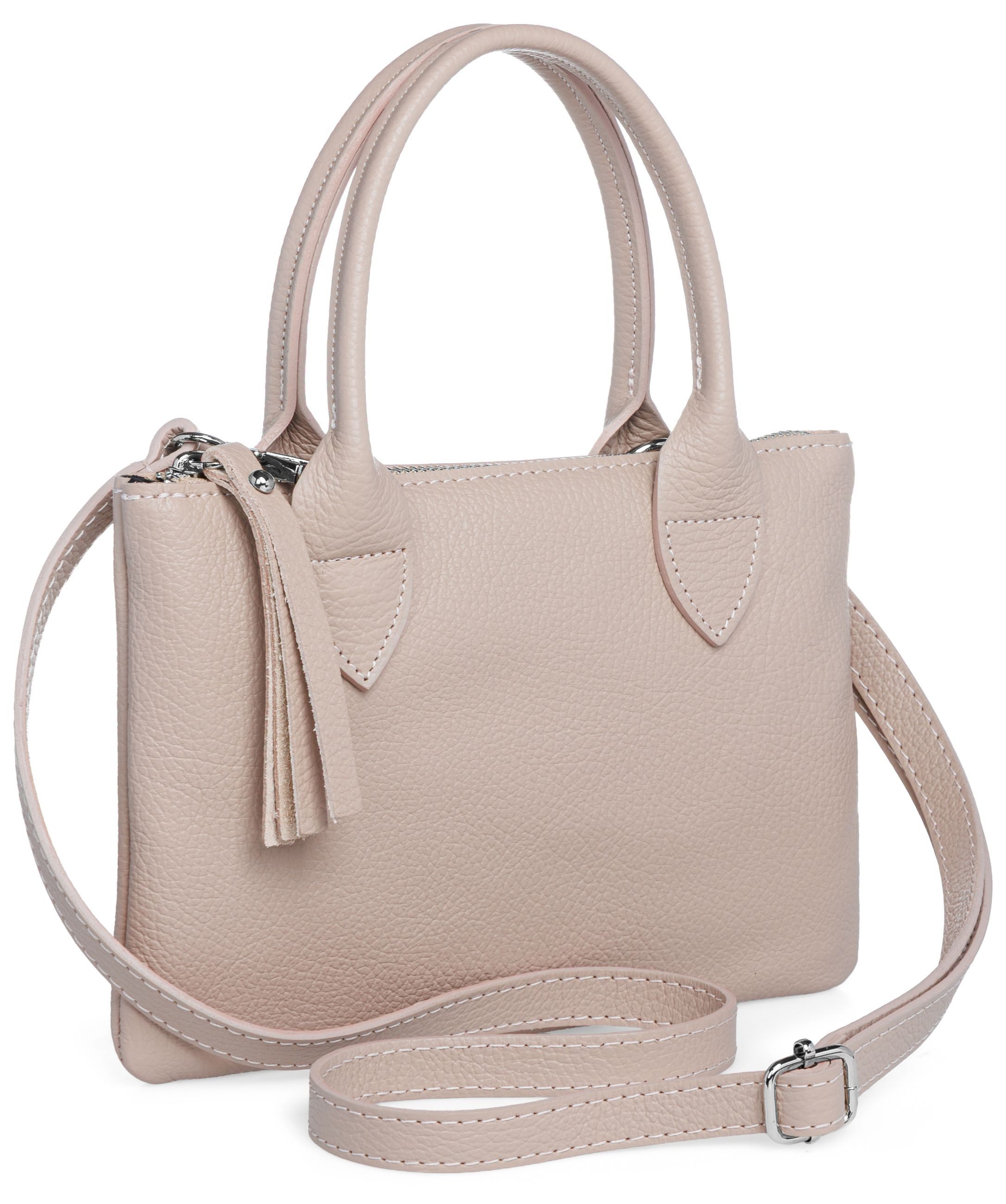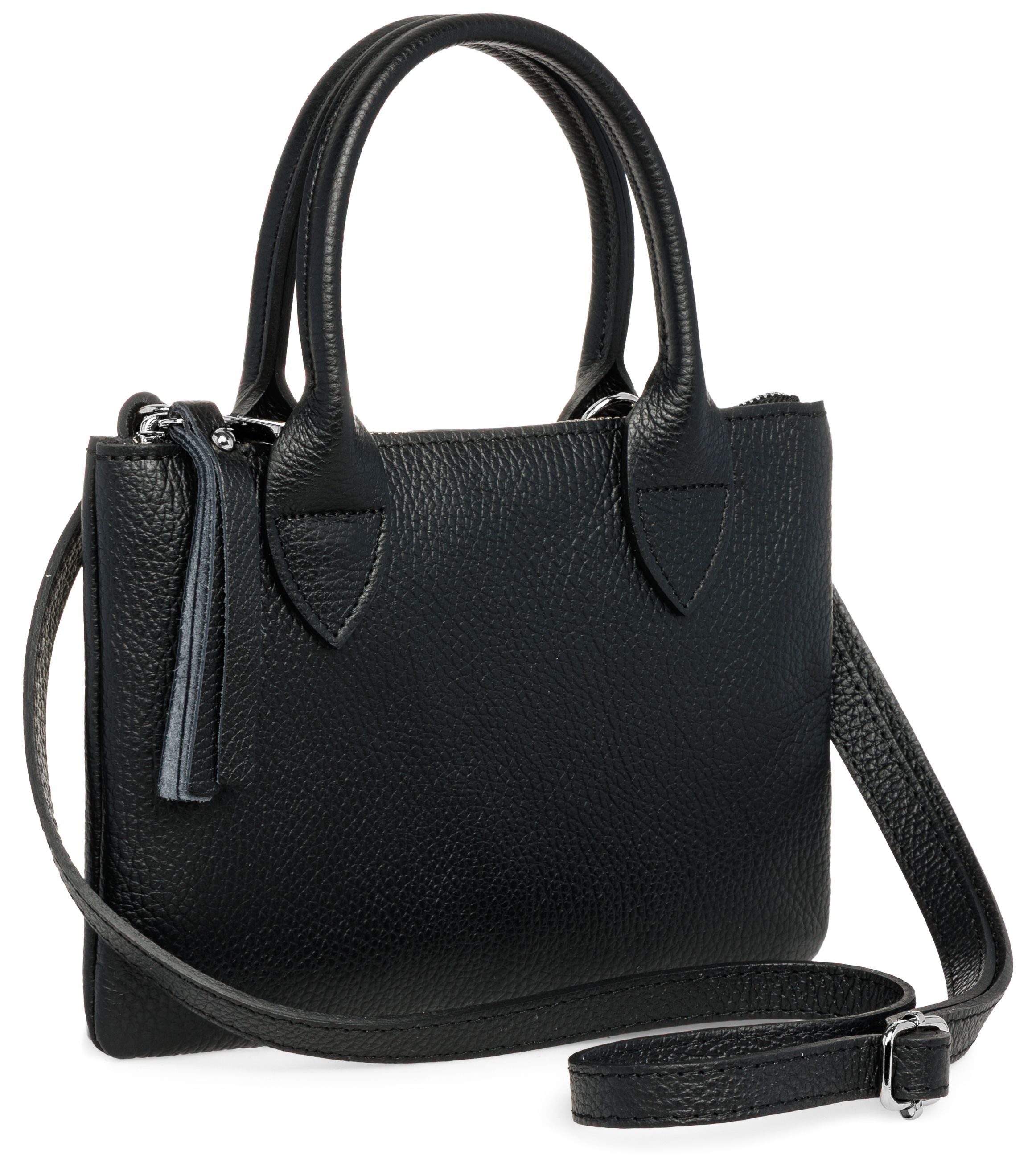 Unsere formschöne Henkeltasche aus hochwertigem, italienischem Dollaro-Leder vereint klassisches Design mit moderner Funktionalität. Das fein genarbte Echtleder verleiht der Tasche eine natürliche, elegante Optik und sorgt gleichzeitig für eine angenehm weiche Haptik. Mit ihren kompakten Maßen von ca. 23,5 x 16,5 x 2 cm (L x H x B) bietet die Tasche genug Platz für deine wichtigsten Essentials wie Smartphone, Schlüssel, kleine Geldbörse oder Make-up - und bleibt dabei angenehm schlank und handlich. Trotz ihres leichten Gewichts von nur ca. 255 g wirkt sie hochwertig und robust. Dank der beiden eleganten Tragehenkel liegt die Tasche angenehm in der Hand. Für noch mehr Flexibilität sorgt der abnehmbare, stufenlos verstellbare Schulterriemen (ca. 65–125 cm), mit dem sie auch bequem als Schulter- oder Crossbody Bag getragen werden kann - je nach Outfit oder Anlass. Das Hauptfach ist sicher mit einem Reißverschluss verschließbar. Innen bietet ein praktisches Einsteckfach Übersicht und Ordnung. Außen sorgt eine feine Quaste an der Reißverschlussschlaufe für eine dezente, modische Note.