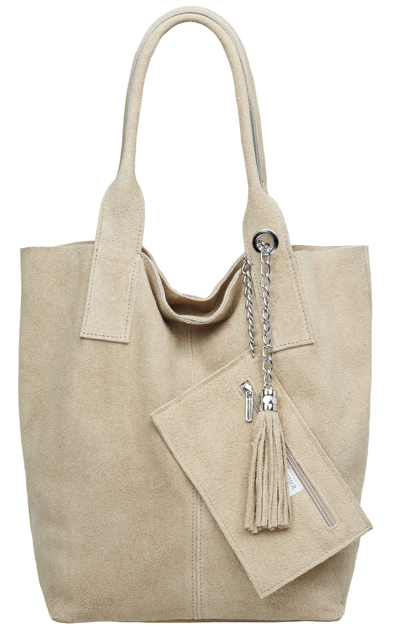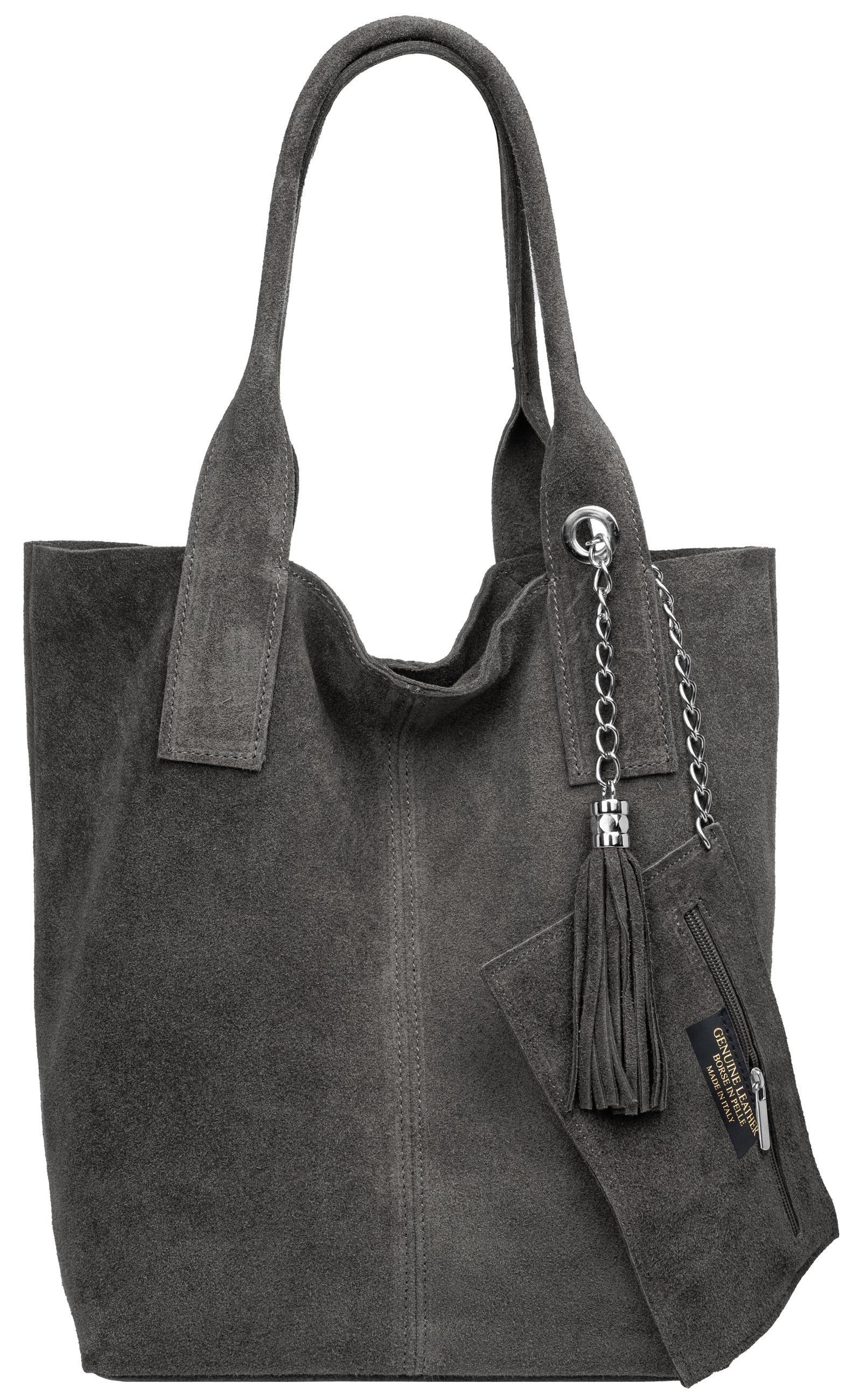 Unsere wunderschöne große Damen Shopper-Tasche aus echtem italienischen Wildleder überzeugt durch ihr minimalistisches Design, seine klare Formgebung und die praktische Alltagstauglichkeit. Die Tasche wird aus robustem, dennoch angenehm weichem Camuscio Classico Wildleder gefertigt und verzichtet bewusst auf ein Innenfutter. Das natürliche Leder bleibt damit sowohl außen als auch innen sichtbar. Dank seines rechteckigen Formats und einer Размер von ca. 26x16x34 cm (LxBxH) bietet der Shopper großzügigen Stauraum für alles, was im Alltag nicht fehlen darf. Das Hauptfach ist mit einem Reißverschluss sicher verschließbar und bietet ausreichend Platz für DIN A4-Unterlagen, Laptop, Tablet oder Hefter. Zusätzlich befindet sich im Inneren eine kleine, an einer Metallkette befestigte Reißverschlusstasche - ideal für Wertsachen oder kleinere Gegenstände. Die rauen Wildleder-Henkel sorgen für einen rutschfesten und bequemen Halt auf der Schulter. Ein praktisches, sehr angenehm zu tragendes Leichtgewicht (ca. 495 gr / ca. 610 gr bei den metallic Farben) aus etwas dünnerem, aber trotzdem straparzierfähigem Material.. Ob im Büro, beim Einkaufen, in der Schule oder in der Freizeit - unsere Wildledertasche ist ein vielseitiger und stilvoller Begleiter und bietet darüber hinaus als Modell unserer CLASSIC-LINE ein sehr gutes Preis-Leistungs-Verhältnis.