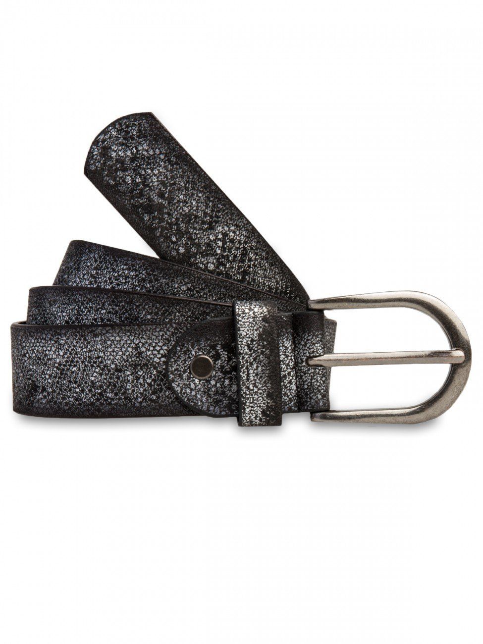 Damen Vintage Gürtel mit Schlangenmuster. Die Oberseite des Gürtels ist mit einer dezenten vollflächigen Schlangenhaut Prägung versehen. Das Besondere dabei ist dass der Gürtel von weitem schlicht und einfarbig wirkt und erst bei näherem Hinsehen seine attraktive Oberfläche preisgibt. Die oberen und unteren Kanten des Leders verlaufen von aussen nach innen von Dunkel nach Hell, was dem Gürtel seinen unverwechselbaren Vintage Look verleiht. Die Oberseite des Gürtels besteht aus ledergeprägtem Feinsynthetic und setzt durch ihren metallischen Schimmer einen weiteren wertigen Aspekt. Die Innenseite ist aus trageangenehmen echtem Veloursleder. Kombiniert wird dieses Accessoire zum lässigen Freizeit Vintage Look, zur Jeans oder auch als figurbetonendes Accessoire über dem Longtop. Der Gürtel hat eine Breite von 3,2 cm. Caspar Fashion.