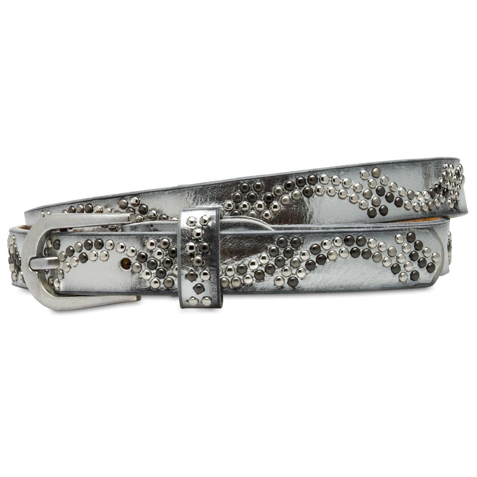 Dieser dezente schmale Nietengürtel ist das perfekte Vintage Accessoire zu Ihrem Kleid, Jumpsuite, Longtop oder auch für Ihre Hose. Der Gürtel ist komplett mit einem aus gegeneinander versetzten Nieten-Halbkreisen bestehenden Muster besetzt wirkt aber wegen seiner Breite von nur ca. 18 mm sehr dezent und hochwertig. Die Nieten sind mit dem darunterliegenden Gürtel aus robstem Kunstleder fest verbunden und überstehen problemlos auch jede Party. Die Innenseite des Gürtels besteht aus angenehmem Wildleder. Breite des Gürtels: 18mm. Material: Außenseite: Kunstleder, Innenseite: Wildleder. Caspar Fashion.