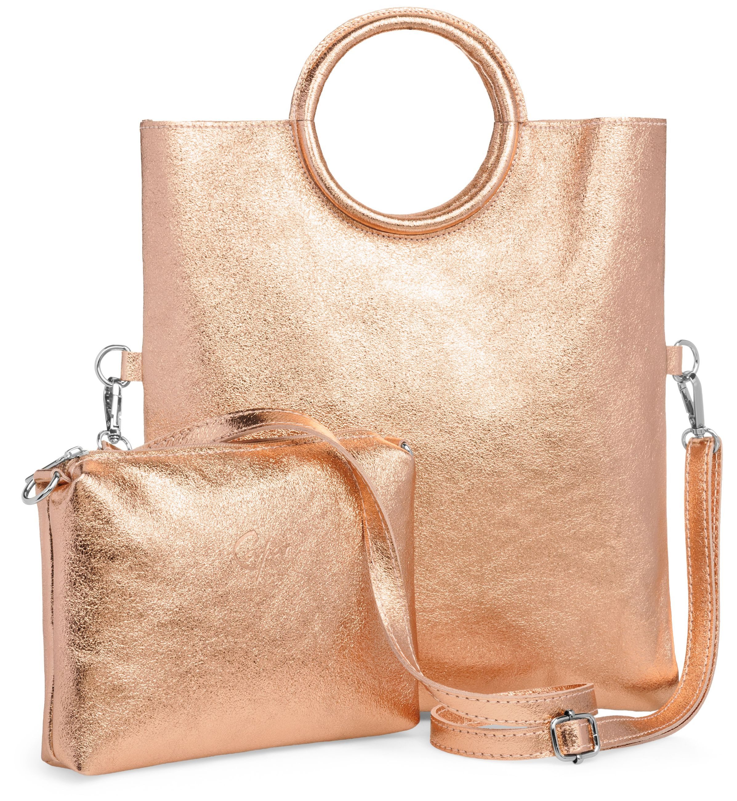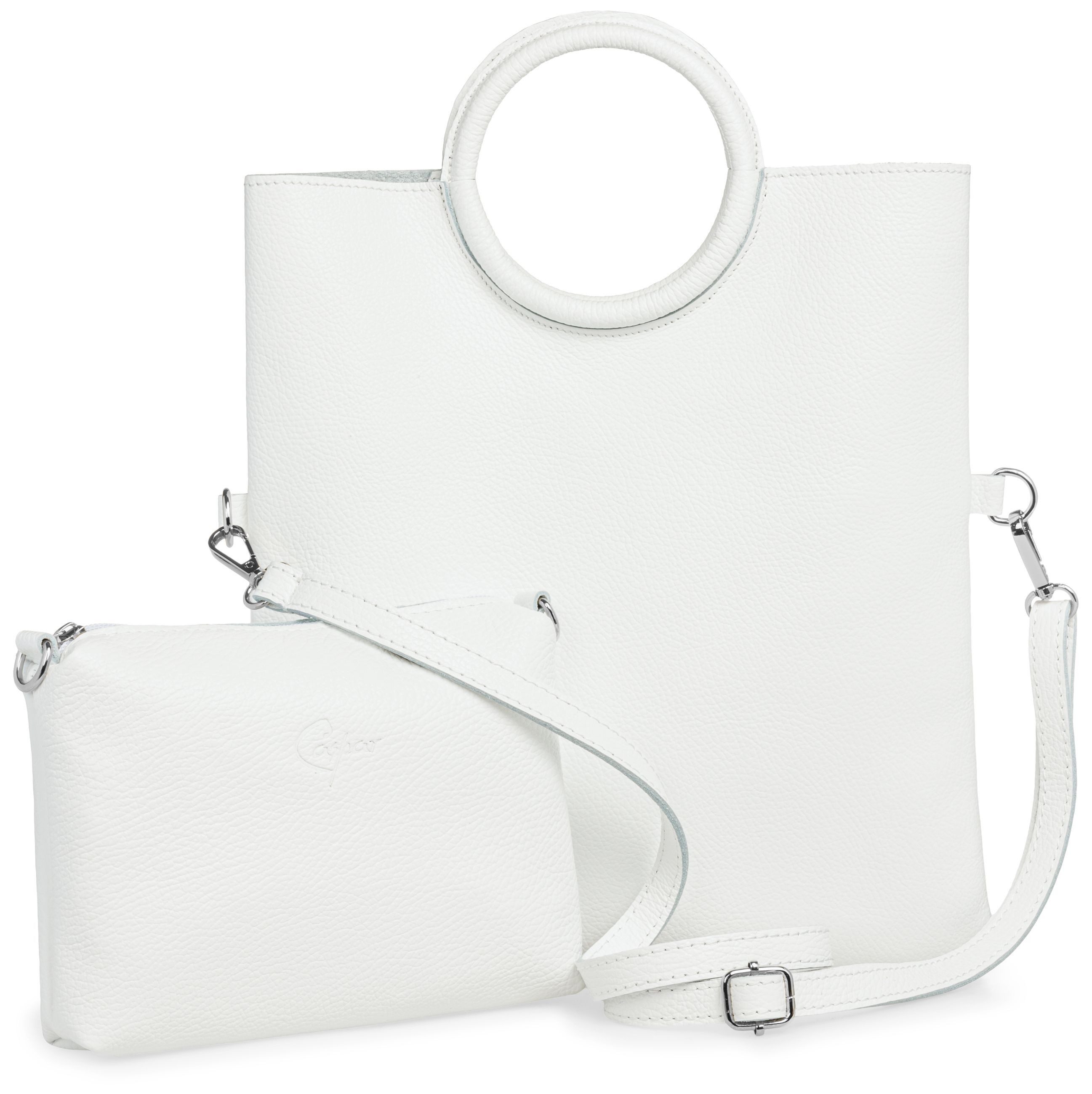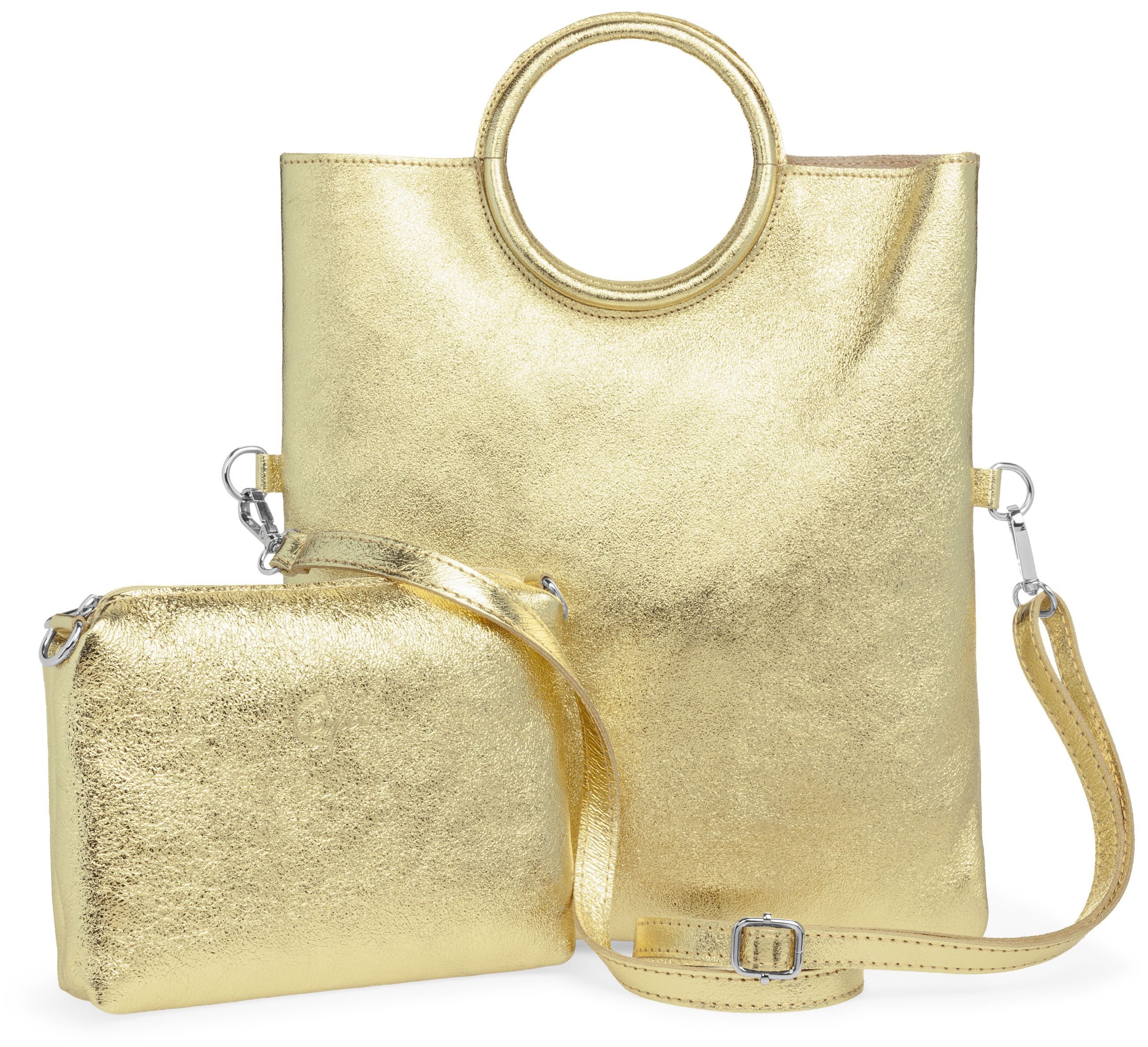 Unser elegantes Taschenset besteht aus zwei perfekt aufeinander abgestimmten Einzelteilen: einer modernen Henkelhandtasche mit Rundgriffen sowie einer herausnehmbaren, vollwertigen Umhängetasche. Gefertigt aus hochwertigem, italienischem Dollaro-Leder mit feiner Narbung. Die große Haupttasche mit ihren markanten Rundhenkeln lässt sich angenehm in der Hand oder mit dem längenverstellbaren Schulterriemen (ca. 70-125 cm) auch bequem crossbody oder über der Schulter tragen. Sie bietet ausreichend Platz für alle Essentials und eignet sich perfekt für jeden Anlass. Die kleinere Innentasche kann dank eigener Metallösen und mitgeliefertem Schulterriemen auch separat als kompakte Crossbody-Bag genutzt werden - ideal für minimalistische Outfits, Abendveranstaltungen oder kurze Erledigungen. Mit ihrem klaren, urbanen Design, dem robusten Material und der hochwertigen Verarbeitung ist dieses 2-in-1-Set eine vielseitige und stilvolle Lösung für alle, die Wert auf Qualität, Funktion und besonderes Design legen.