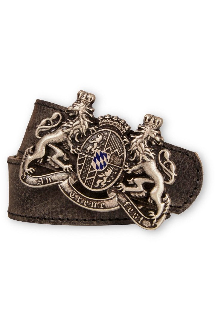 Dieser urig-schicke Trachten Ledergürtel im zünftigen Design mit der Schließe im bayerischen Design von der Marke Der Trachtler by Cassandra ist eine stilvolle Ergänzung zur Lederhose und Trachtenjeans. Der Lederriemen hat eine feine Struktur sowie eine dezente Färbung und eine robuste Naht in Kontrastfarbe. Die massive Koppelschließe in Altsilber zeigt als Retro-Motiv die Helmplatte der Bayerischen Armee um 1914: zwischen zwei nach außen schauenden, gekrönten Löwen ist ein ovales Wappen mit kleiner Krone platziert. Die Bayernrauten im Wappen sind teils blau gefärbt. Unter den Löwen befindet sich ein Banner mit dem Wahlspruch des Königreichs Bayern "In Treue fest". Der Gürtel wird in Bayern handgefertigt.