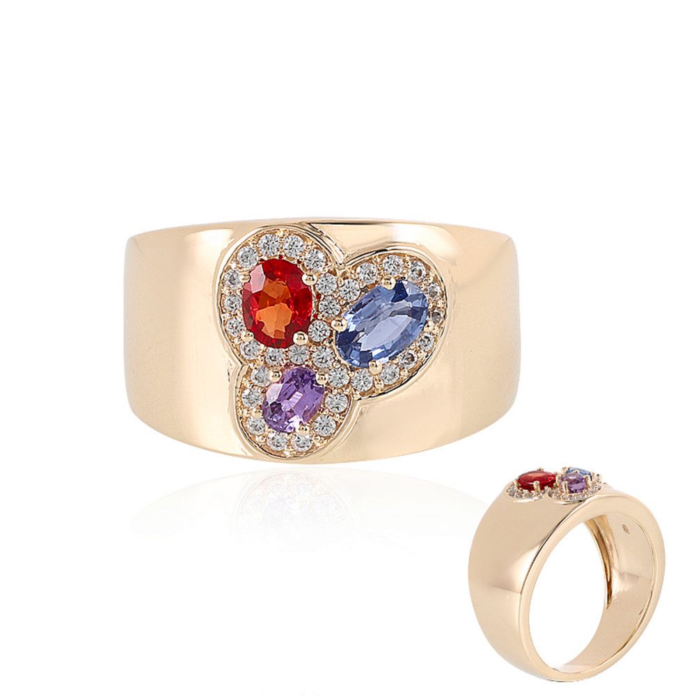 Unser Saphir-Goldring (Adela Gold) setzt ein strahlendes Highlight aus feinsten Ceylon-Saphiren und funkelnden Zirkonen. Perfekt für Erstkäufer und Schmuckliebhaber, zeigen die blauen, abendroten und purpurfarbenen Ovalschliff-Saphire eine exquisite Farbvielfalt, meisterhaft eingefasst in hochwertiges 375er Gelbgold. Die Kombination aus 1,475 Karat Edelsteinen macht diesen Ring zu einem eleganten Begleiter für festliche Anlässe oder den anspruchsvollen Alltag. Für erfahrene Kenner bietet der Ring durch seine sorgfältige Anordnung und das Zusammenspiel der Edelsteine ein beeindruckendes Farbspiel, das sowohl zu klassischen Abendroben als auch modischen Outfits passt.