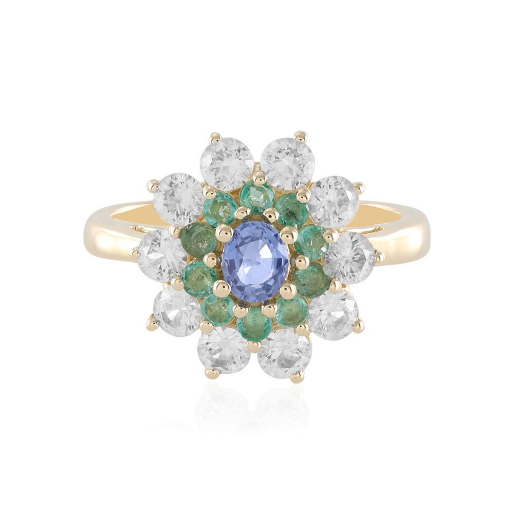 Der Edelstein-Goldring „Adela Gold" von Cavill begrüßt sowohl Erstkäufer als auch erfahrene Schmuckliebhaber mit einer faszinierenden Kombination aus unerhitztem blauen Ceylon-Saphir und leuchtenden russischen Smaragden, die meisterhaft in 375er Gelbgold eingefasst sind. Der ovale Brillantschliff des Saphirs aus Sri Lanka fängt das Licht brilliant ein und wird von einem Halo aus funkelnden Zirkonen aus Kambodscha und Smaragden aus Russland umgeben. Dieses Schmuckstück ist perfekt für festliche Anlässe, elegante Dinner oder als stilvoller Begleiter im Alltag und harmoniert wunderbar mit klassischen Abendkleidern oder hochwertigen Business-Outfits.