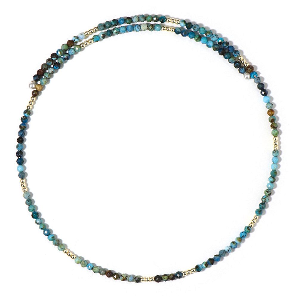 Der Chrysokoll-Stahlhalsreif "Riya" ist eine exquisite Halskette, die insbesondere Erstkäufer mit ihrer lebendigen Farbpalette der peruanischen Chrysokoll-Perlen begeistert. Diese sind meisterhaft in Kombination mit goldenen Hämatit-Akzenten aus den USA und zarten weißen Süßwasserzuchtperlen aus China gefertigt. Für Kenner bietet dieses Schmuckstück eine perfekte Symbiose aus facettierten Rundperlen, die facettenreich schimmern, und einem robusten, dennoch eleganten Stahlhalsreif. Der vielseitige Halsschmuck ergänzt sowohl lässige Casual-Outfits als auch elegante Abendgarderoben und macht ihn zu einem idealen Accessoire für festliche Anlässe oder den Alltag.