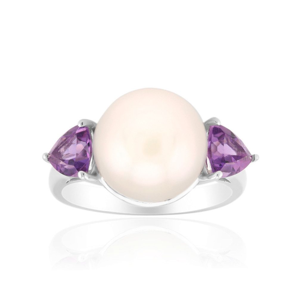 Dieser weiße Süßwasserzuchtperlen-Silberring vereint klassische Schönheit mit edlen Details. Die 10 mm große, strahlend weiße Perle aus China wird von fein facettierten Amethysten aus Brasilien im brillanten Trillantschliff kunstvoll eingefasst. Dieses Schmuckstück ist ideal für Erstkäufer, die Wert auf höchste Qualität legen, und beeindruckt zugleich erfahrene Schmuckliebhaber mit seinem harmonischen Design und der präzisen Verarbeitung in 925er Sterlingsilber. Ob zum eleganten Abendkleid oder zur stilvollen Bluse – der Ring setzt glänzende Akzente bei festlichen Anlässen und im Alltag.