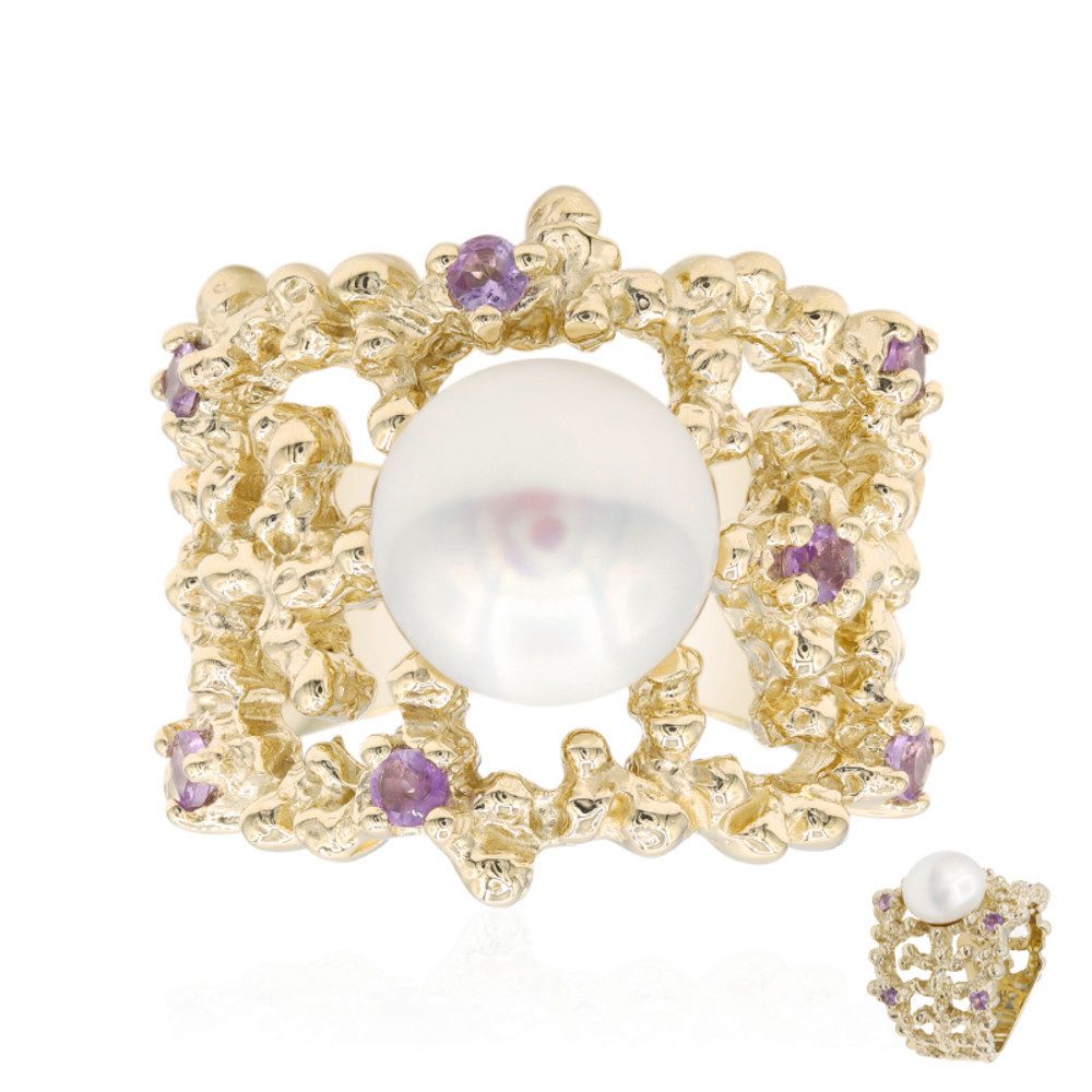 Der Weiße Süßwasserzuchtperlen-Silberring (TPC) ist ein bezauberndes Schmuckstück, das besonders Einsteiger in die Welt der Edelsteine und Perlen anspricht. Die zentrale, weiße Süßwasserzuchtperle aus China besticht durch ihren schimmernden, irisierenden Glanz und rundet jeden Look elegant ab. Umgeben wird die Perle von sieben funkelnden Amethysten aus Brasilien, die in 925er vergoldetem Sterlingsilber gefasst sind – ein Meisterwerk feinster Goldschmiedekunst. Dieses organisch-filigrane Design erinnert an natürliche Formen und lässt sich hervorragend mit eleganter Abendgarderobe oder einem klassischen Business-Outfit kombinieren. Egal ob festliche Anlässe oder der Alltag – dieser luxuriöse Ring verleiht jedem Look das gewisse Etwas.